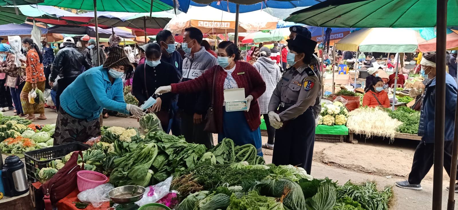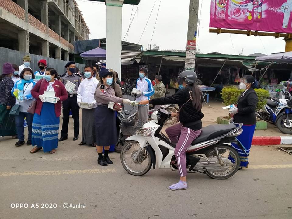 ရှမ်းပြည်နယ်အရှေ့ပိုင်း ကျိုင်းတုံတွင် ကိုဗစ်-၁၉ ရောဂါ ဖြစ်ပွားနေစဉ်ကာလအတွင်း ဒေသခံပြည်သူများအား ကူးစက်မှု မရှိစေရေးအတွက် နှာခေါင်းစည်း Mask များ တပ်ဆင်သွားလာကြစေရန် မျက်နှာ နှာခေါင်းစည်းအကာများ အခမဲ့ဖြန့်ဝေပေးနေမှုကို ယနေ့ နံနက်ပိုင်းတွင် ကျိုင်းတုံမြို့ ပြည်ထောင်စုလမ်းမတစ်လျှောက်၊ မြို့မဈေးတို့တွင် ပြုလုပ်ပေးခဲ့ကြောင်း သိရသည်။