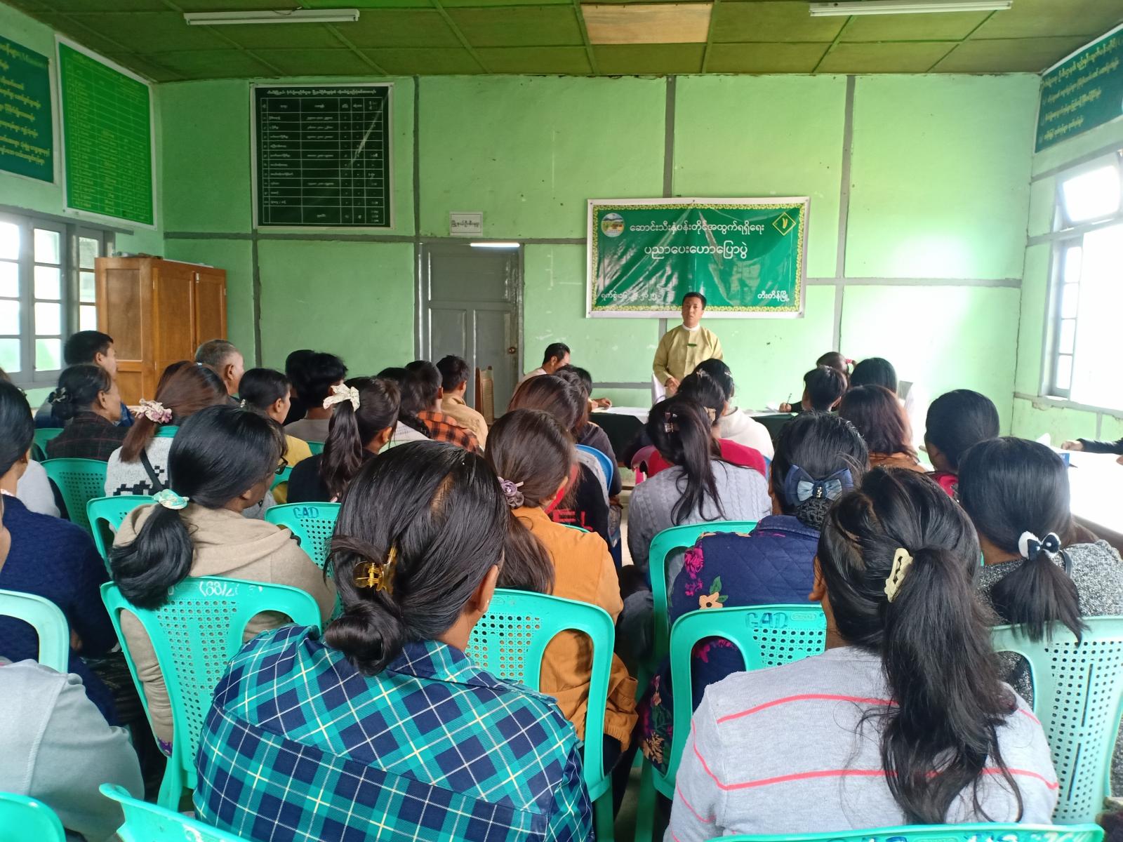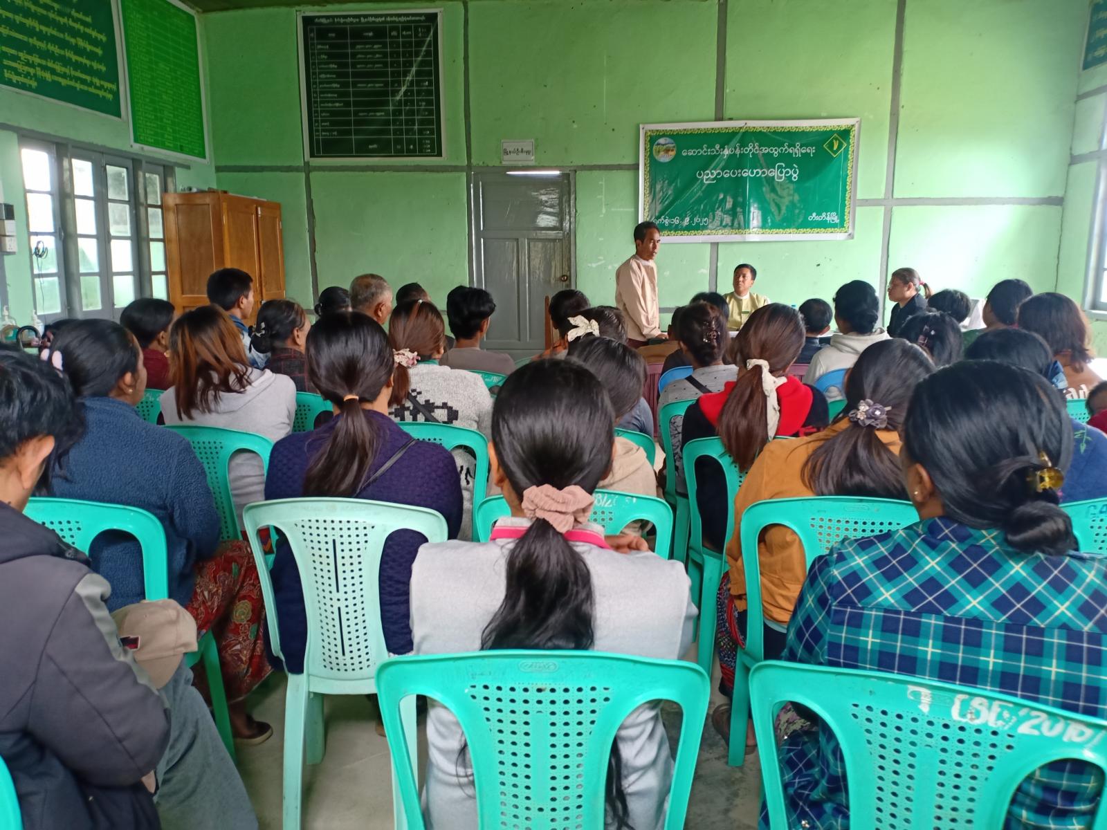 ရှေးဦးစွာ မြို့နယ်စိုက်ပျိုးရေးမွေးမြူရေးနှင့် ကျေးလက်ဒေသဖွံ့ဖြိုးတိုးတက်ရေး လုပ်ငန်းအကောင်အထည်ဖော် စီမံကြီးကြပ်ရေးကော်မတီဥက္ကဋ္ဌ ဦးဖြိုးဝင်းသန်းကအမှာစကားပြောကြားပြီး မြို့နယ်စိုက်ပျိုးရေးဦးစီးမှူးက ဆောင်းသီးနှံပန်းတိုင်အတွက် ရရှိရေးပညာပေးဟောပြောခဲ့သည်။