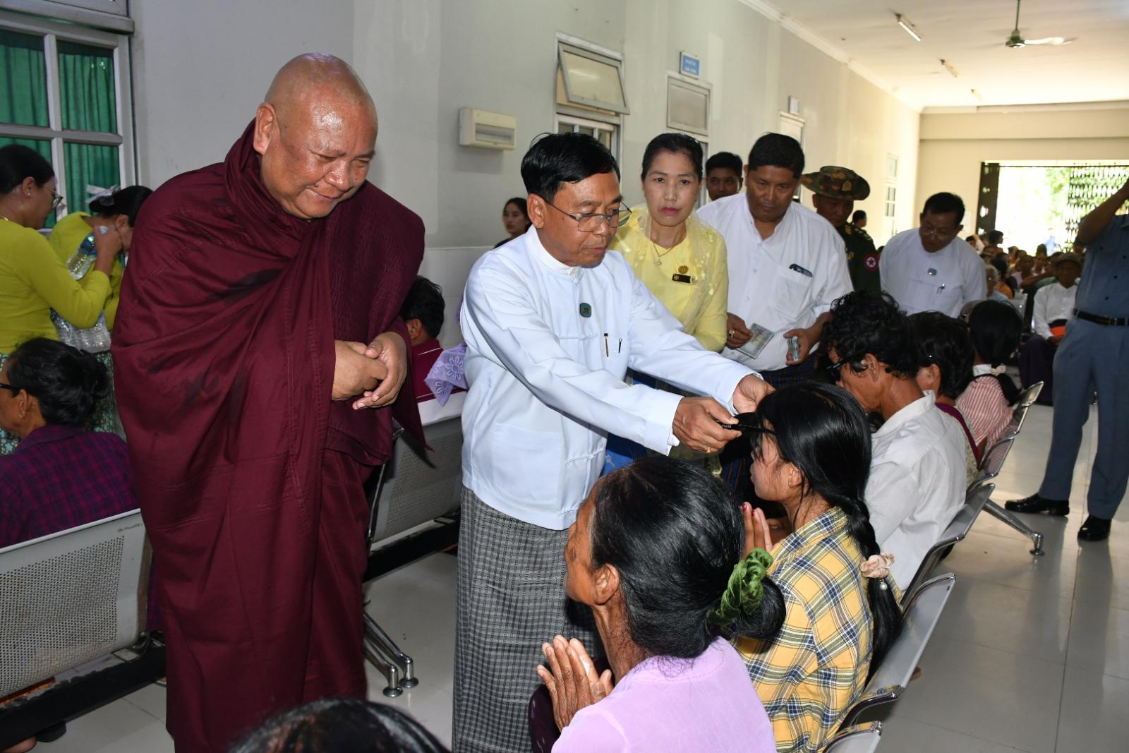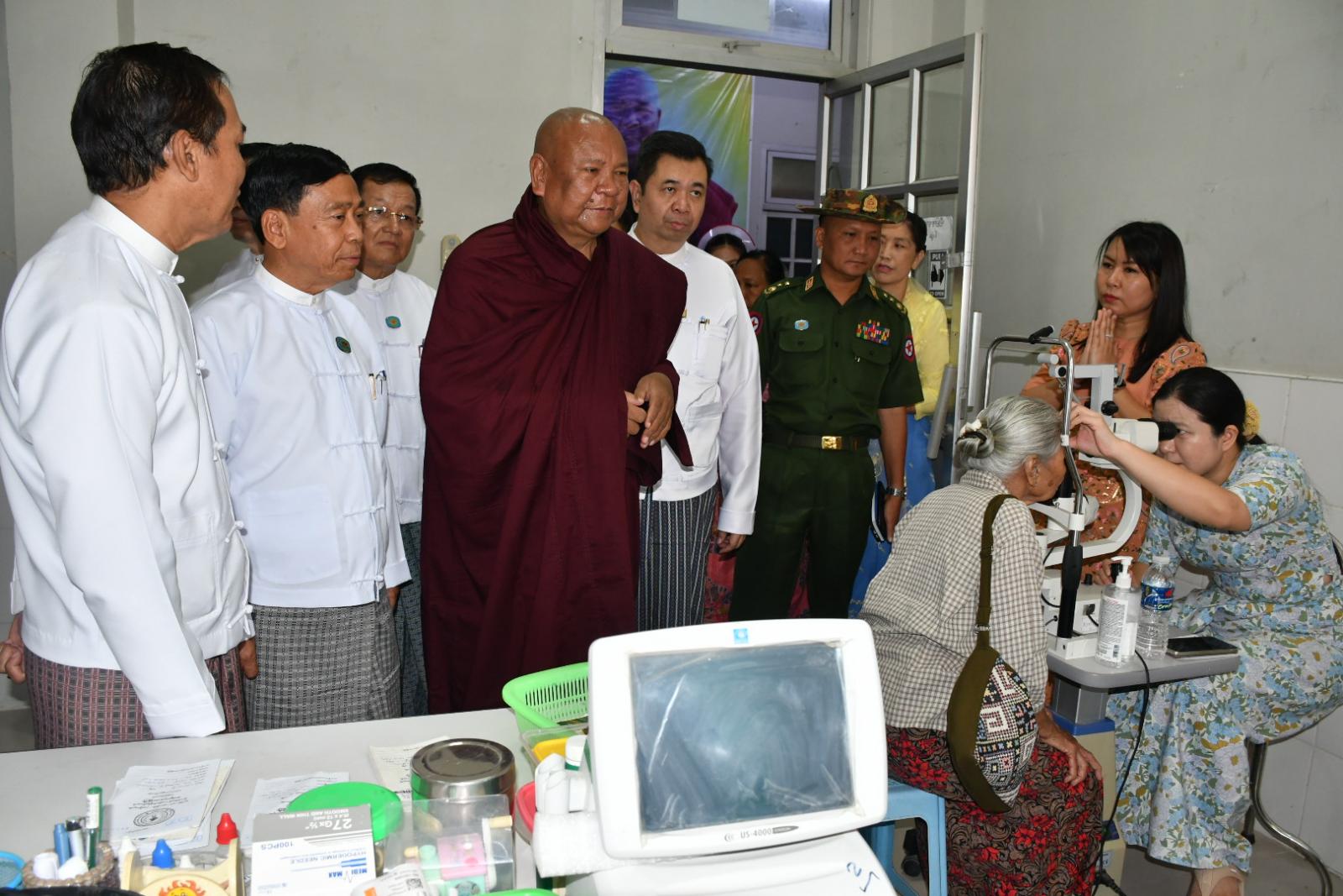 ဆက်လက်၍ နေပြည်တော်ကောင်စီဥက္ကဋ္ဌ ဦးသန်းထွန်းဦးသည် ကျန်းမာရေးဝန်ကြီးဌာန ဒုတိယဝန်ကြီး၊ နေပြည်တော်ကောင်စီဝင်များ၊ တာဝန်ရှိသူများနှင့်အတူ သဲဖြူဆရာတော်ကြီးအား အမှူးထား၍ ကျန်းမာရေးဝန်ကြီးဌာန၏ ဦးဆောင်ပံ့ပိုးမှု၊ နေပြည်တော်ကောင်စီ၏ ပံ့ပိုးမှုနှင့် အလှူရှင်များ၏ လှူဒါန်းမှုများဖြင့် နေပြည်တော်၊ ပုဗ္ဗသီရိမြို့နယ် သွားနှင့် ခံတွင်းအထူးကုဆေးရုံကြီး၌ နေပြည်တော် မျက်စိ၊ နား၊ နှာခေါင်း၊ လည်ချောင်း၊ ဦးခေါင်းနှင့် လည်ပင်းခွဲစိတ်ရောဂါထူးကု ဆေးရုံကြီးမှ ပါမောက္ခ (မျက်စိ) နှင့် မျက်စိအထူးကုဆရာဝန်ကြီးများမှ အခမဲ့မျက်စိခွဲစိတ်ကုသမှုပေးနေမှုအား ကြည့်ရှုအားပေးခဲ့ပြီး လာရောက်ဆေးကုသမှုခံယူသည့် ပြည်သူများအား နေကာမျက်မှန်၊ ပါဝါမျက်မှန်များနှင့် အာဟာရဖြစ်စားသောက်ဖွယ်ရာများ ပေးအပ်ခဲ့သည်။ ယင်းနောက် ဆေးရုံအစည်းအဝေးခန်းမတွင် အခမဲ့မျက်စိခွဲစိတ်ကုသလှူဒါန်းမှုအတွက် တရားနာရေစက်ချအလှူ ပြုလုပ်ခဲ့ကြောင်း သိရသည်။
