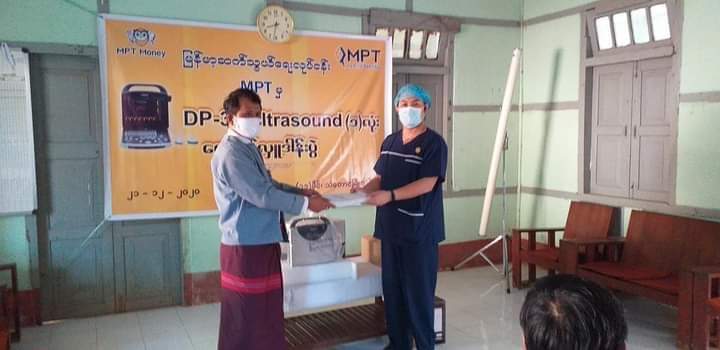 ကရင်ပြည်နယ် မြန်မာ့ဆက်သွယ်ရေးလုပ်ငန်း MPT မှ ပြည်နယ် မန်နေဂျာ ဦးကိုကိုအောင်က DP-30 Ultrasound စက်လှူဒါန်းခြင်းနှင့်ပတ်သက်၍ ရှင်းလင်းပြောကြားခဲ့ပြီး DP-30 Ultrasound စက်အား သံတောင်မြို့ ပြည်သူ့ဆေးရုံတာဝန်ခံ ဒေါက်တာစစ်သွေးပိုင်ထံ ပေးအပ်ခဲ့သည်။