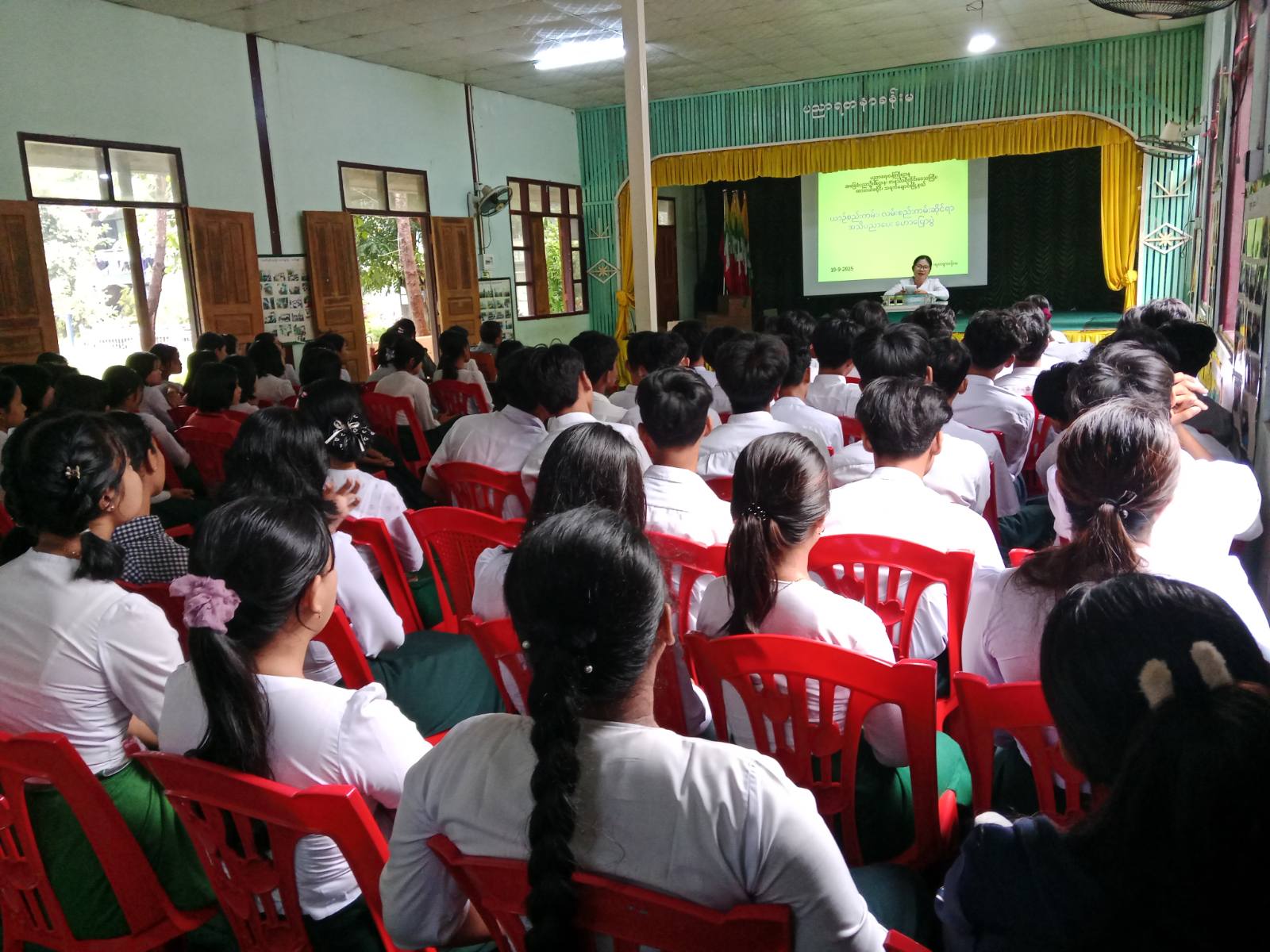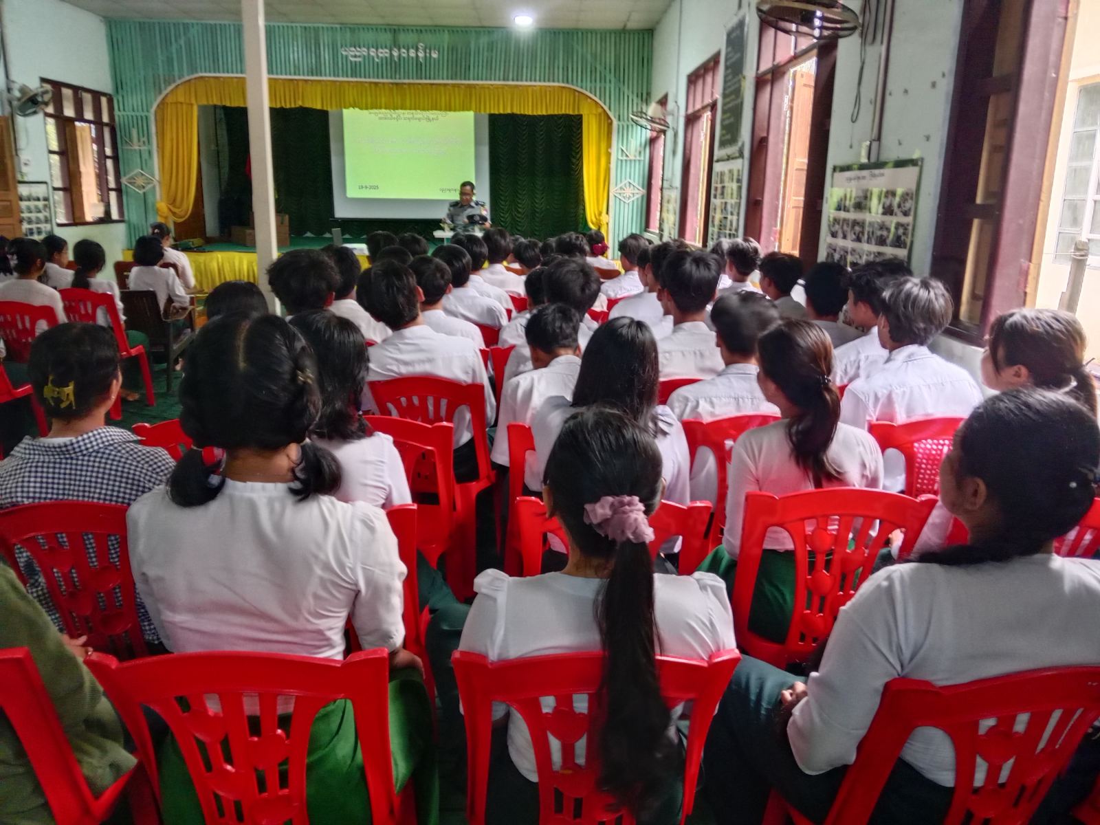 ထို့နောက်  မြို့နယ် ပြန်ကြားရေးနှင့်ပြည်သူ့ဆက်ဆံရေးဦးစီးဌာနမှ ဦးစီးအရာရှိ ဒေါ်နန်းခလိုက်ရှု က ကျောင်းသားကျောင်းသူများအား စာဖတ်ရှိန်မြှင့်တင်ရေး စာအုပ်၊ စာပေဖတ်ရှုခြင်းမှ ရရှိနိုင်သည့် အကျိုးကျေးဇူးများအကြောင်း အသိပညာပေးဟောပြောခြင်းနှင့် မိမိတို့ပြန်ကြားရေးနှင့် ပြည်သူ့ဆက်ဆံရေးဦးစီးဌာန၊ ပြည်သူ့စာကြည့်တိုက်တွင် အသိပညာဗဟုသုတရရှိစေရန် စာအုပ်စာပေများနှင့် သုတ၊ ရသ၊ စာအုပ်စာစောင်များကို အခမဲ့ လာရောက်ဖတ်ရှုပြီး ငှားရမ်းလိုပါက စာကြည့်တိုက်အသင်းဝင်၍ အခမဲ့ငှားရမ်းနိုင်ကြောင်း ရှင်းလင်းပြောကြားခဲ့သည်။
