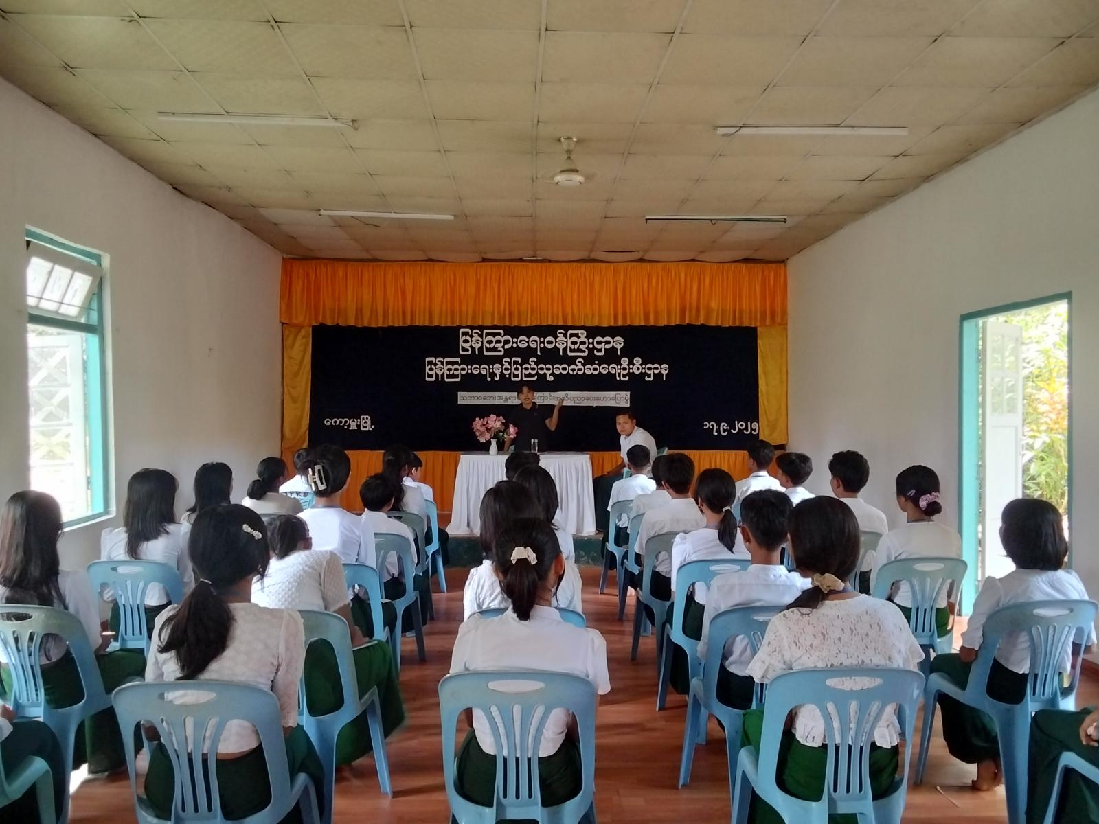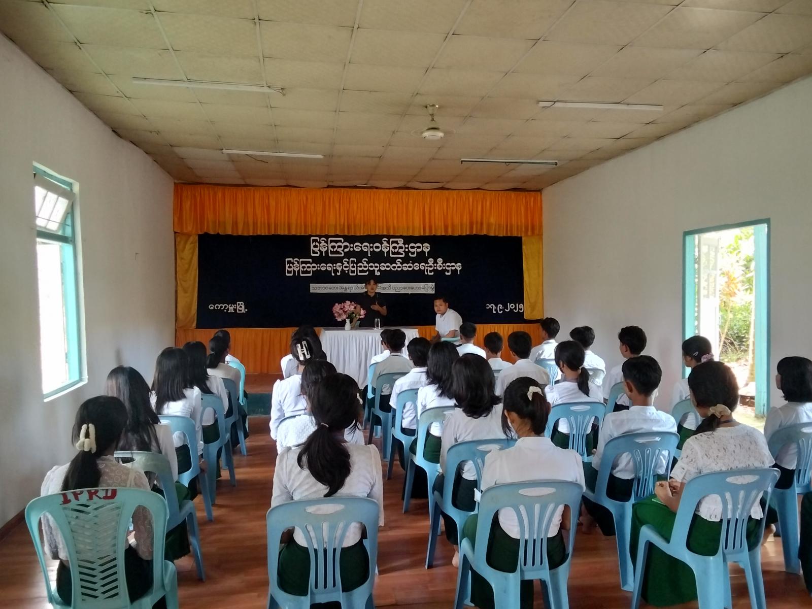 ဟောပြောပွဲတွင် မြို့နယ်ပြန်ကြားရေးနှင့်ပြည်သူ့ဆက်ဆံရေးဦးစီးဌာနမှ ဦးစီးအရာရှိ ဒေါ်ဇာခြည်စိမ့်နှင့် ဒုတိယဦးစီးမှူး ဦးထက်မြက်သူတို့ကပြောကြားရာတွင် ကမ္ဘာအရပ်ရပ်တွင် ဘေးအန္တရာယ်အမျိုးမျိုးကျရောက်ခံစားရလျက်ရှိပြီး ထို့ဘေးများအနက် သဘာဝဘေးအန္တရာယ်မှ အများဆုံးနှင့်ဒုက္ခအပေးဆုံးဖြစ်ကြောင်း၊ သဘာဝဘေးအန္တရာယ်တစ်ခုကျရောက်တိုင်း လူတို့၏ အသက်အိုးအိမ်စည်းစိမ်များ ထိခိုက်ပျက်စီးစေသည့်သာမက နဂိုအခြေအနေသို့ရောက်ရှိအောင် ပြန်လည်ထူထောင်ရသည့်အတွက် ဖွံ့ဖြိုးတိုးတက်မှုနှောင့်နှေးပါကြောင်း၊ ထို့ကြောင့် သဘာဝဘေးအန္တရာယ်မကျရောက်မီကပင် ကြိုတင်ကာကွယ်ရေးလုပ်ငန်းများ မလွဲမသေပြုလုပ်ရန် လိုအပ်ကြောင်း၊ လူသားတို့၏စည်းကမ်းမဲ့ လုပ်ဆောင်ချက်များကြောင့် သဘာဝပတ်ဝန်းကျင်မှာ တစ်စတစ်စယိုယွင်းပျက်စီးလာသဖြင့် ရာသီဥတုသည် ပုံမှန်မဟုတ်တော့ဘဲ ပြောင်းလဲလာပြီး သဘာဝဘေးအန္တရာယ်များဖြစ်ပေါ်လာကြောင်းနှင့် သဘာဝဘေးအန္တရာယ်အမျိုးအစားများ၊ သဘာဝဘေးအန္တရာယ်ကြိုတင်ကာကွယ်ရေးနည်းလမ်းများမှ ဆောင်ရန်၊ရှောင်ရန်များ မုန်တိုင်းဘေး၊ ရေဘေး၊လေဘေးအန္တရာယ်အတွက်ဆုံးရှုံးမှုသက်သာစေရန် ကြိုတင်ပြင်ဆင်ဆောင်ရွက် ရမည့်အချက်များစသည့် သဘာဝဘေးအန္တရာယ်ဆိုင်ရာ အသိပညာပေးအကြောင်းအရာများကို ဟောပြောခဲ့ကြောင်းသိရသည်။ ဆက်လက်၍ ပြန်ကြားရေးနှင့်ပြည်သူ့ဆက်ဆံရေးဦးစီးဌာနမှ ပြသထားသောအသိပညာပေး နံရံကပ်စာစောင်များကိုကျောင်းသား/ ကျောင်းသူများစိတ်ပါဝင်စား စွာလေ့လာကြည့်ရှုနေကြကြောင်း သိရသည်။
