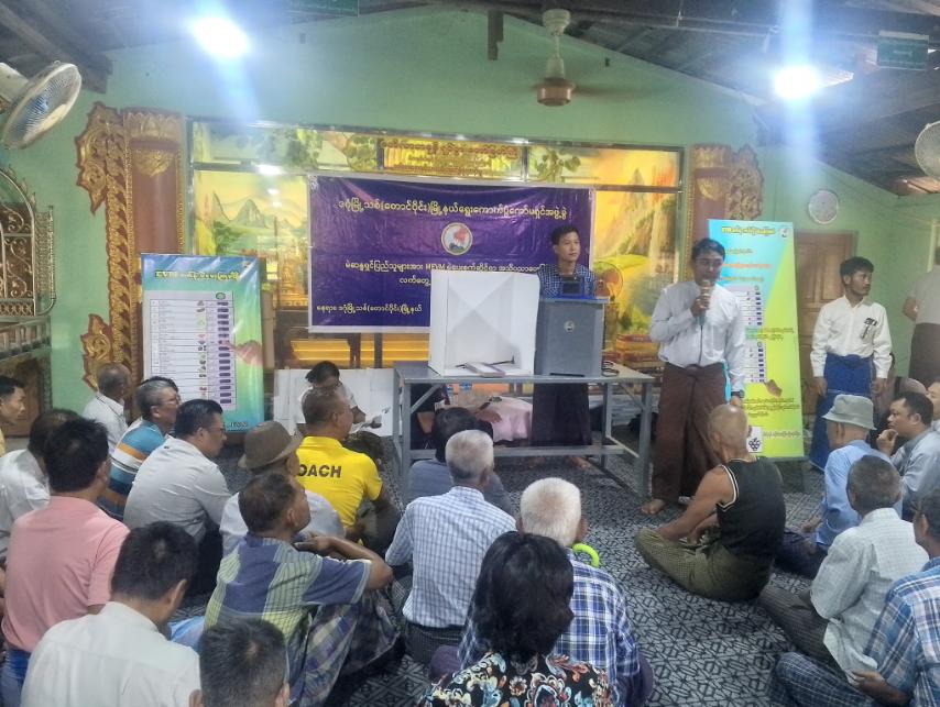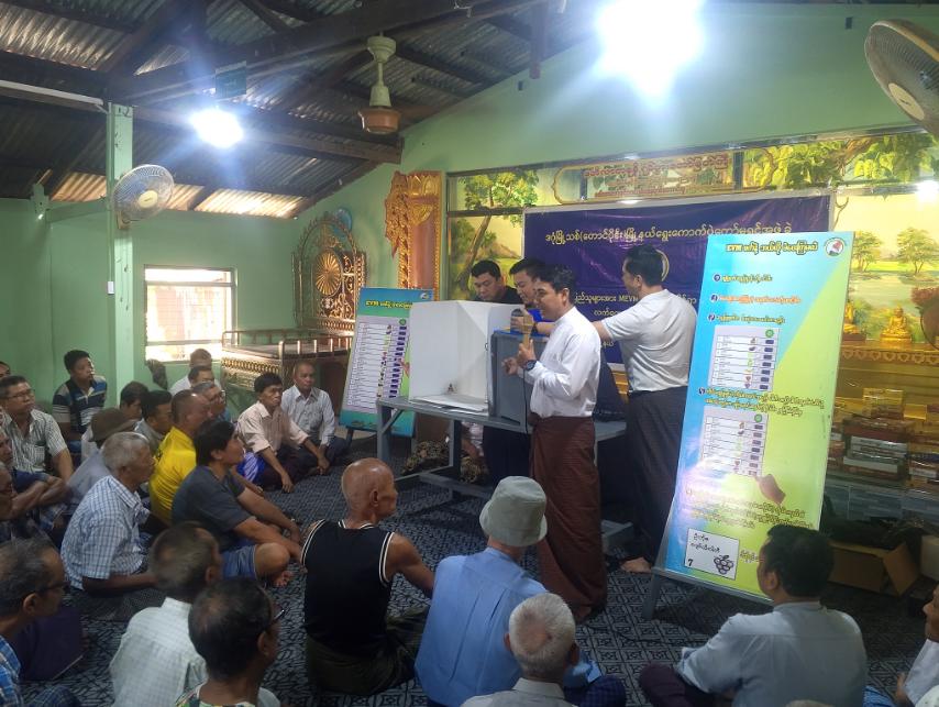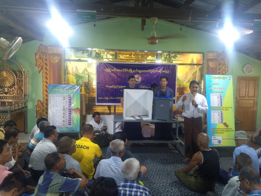 ထို့နောက် တက်ရောက်လာကြသည့် ဒေသခံပြည်သူများအား မြန်မာအီလက်ထရောနစ် (MEVM) မဲပေးစက်အသုံးပြု၍ လက်တွေ့စမ်းသပ်မဲပေးခြင်း၊ မဲပေးစက်မှထုတ်ပေးသည့် မဲရလဒ်စာရွက်နှင့် မဲပုံးအတွင်းရှိ မဲလက်မှတ်များကို တိုက်ဆိုင်စစ်ဆေး၍ မဲရလဒ် မှန်၊ မမှန် စိစစ်ခြင်းစသည့် မဲပေးပုံအဆင့်အဆင့်ကို ပြည်သူများ ကျယ်ကျယ်ပြန့်ပြန့် သိရှိနိုင်စေရန် လက်တွေ့သရုပ်ပြ ဆောင်ရွက်ကြသည်။