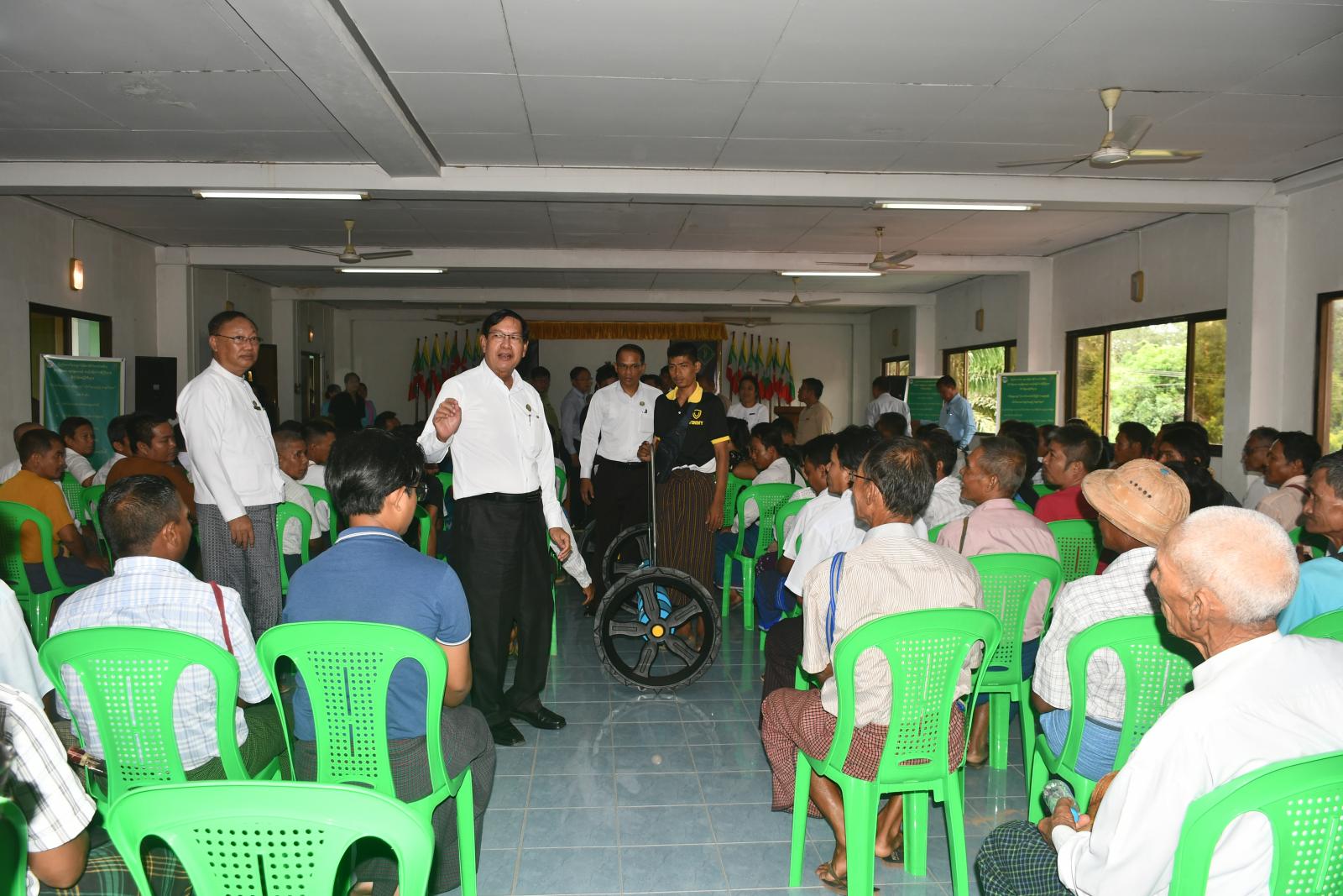 ဆက်လက်၍ တိုင်းဒေသကြီးဝန်ကြီးချုပ်နှင့်အဖွဲ့က ရန်ကုန်တိုင်းဒေသကြီး အစိုးရအဖွဲ့၏ကြီးကြပ်မှုနှင့် နိုင်ငံ့စီးပွားမြှင့်တင်ရေးရန်ပုံငွေဖြင့် ထုတ်လုပ်မည့် တိုက်ရိုက်မျိုးစေ့ချကိရိယာ (Drum Seeder)များအကြောင်း ရှင်းလင်းပြသသည်။