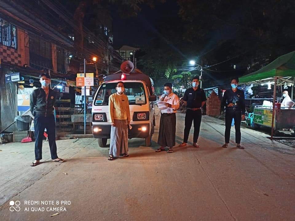 ထိုသို့နှိုးဆော်ရာတွင် ရောဂါ ကာကွယ်ရေးဆိုင်ရာ ညွှန်ကြားချက်များကို လိုက်နာဆောင်ရွက် သွားရန်၊ သတ်မှတ် စည်းကမ်းချက်များနှင့်အညီ နေထိုင်ကြရန်၊ မြို့နယ်အတွင်းရှိ အများပြည်သူ အကျိုးငှာရည်ရွယ်၍ ညမထွက်ရအမိန့်အားထုတ်ပြန် ထားရှိပြီးဖြစ်သဖြင့် နေ့စဉ် ည(၁၂) နာရီမှ နောက်တစ်နေ့နံနက် (၄) နာရီထိ မိမိနေအိမ်မှ ပြင်ပသို့ ထွက်ခွာခြင်း မပြုရန်နှင့် လိုက်နာရန်ပျက်ကွက်ပါက တည်ဆဲဥပဒေများအရ အရေးယူခံရမည်ဖြစ်ကြောင်း စသည်တို့ကို အသိပေးနှိုးဆော်ထားကြောင်း သိရသည်။
