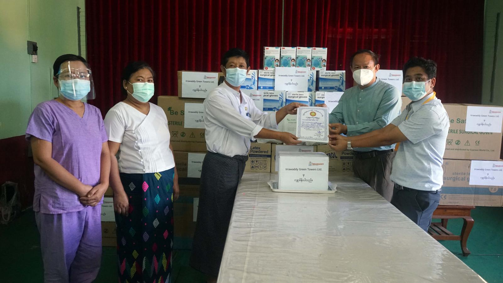 ထိုသို့ပေးအပ်လှူဒါန်းရာတွင် Irrawaddy Green Towers ltd. မှ အစိုးရဆက်ဆံရေးအရာရှိ ဦးမြင့်ရှိန်နှင့် ဒေသ ဆိုင်ရာအင်ဂျင်နီယာ ဦးအောင်မိုးဟိန်း တို့က စုစုပေါင်းတန်ဖိုးငွေကျပ် သုံးဆယ်ငါးသိန်း(၃၅၀၀၀၀၀) တန်ဖိုးရှိ Exam Glove Medium (၂၀၀)ဘူး၊ Surgical Glove (၂၀၀၀) ဘူး၊ N95 Madk Green (၂၀၀)ဘူး၊ Surgical Gown (၃၁၀)ဘူး တို့အား ပေးအပ်လှူဒါန်းရာ ပြည်နယ်ပြည်သူ့ဆေးရုံအုပ်ကြီး ဒေါက်တာဘရန်အောင်နှင့် တာဝန်ရှိသူများက လက်ခံရယူပြီး ဂုဏ်ပြုမှတ်တမ်းလွှာ ပြန်လည်ပေးအပ်သည်။