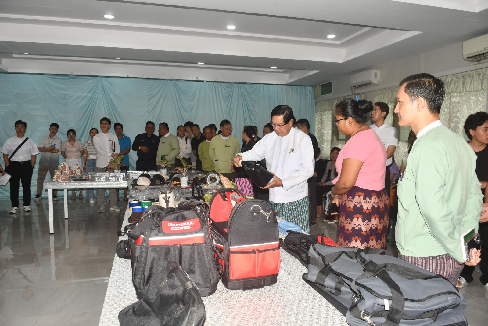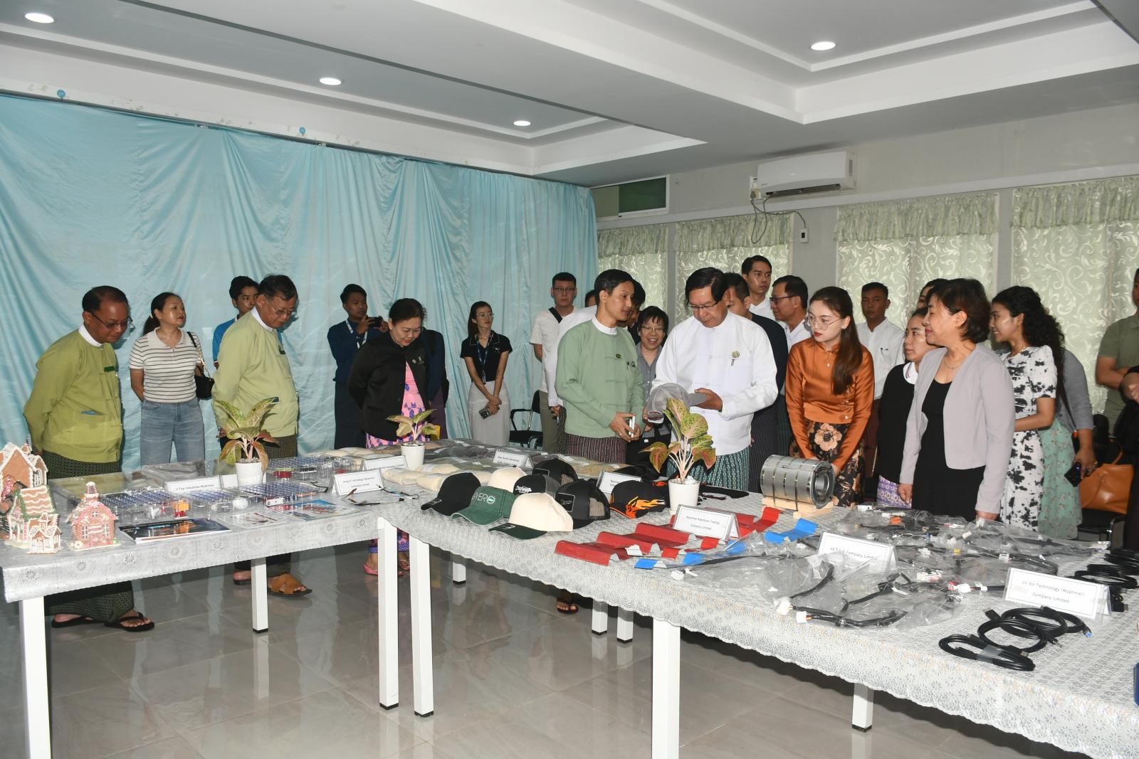 ဦးစွာ ရန်ကုန်တိုင်းဒေသကြီး ဝန်ကြီးချုပ် ဦးစိုးသိန်းနှင့် အဖွဲ့သည် ရင်းနှီးမြှုပ်နှံသူလုပ်ငန်းရှင်များ၏ ထုတ်လုပ်သည့် ပစ္စည်းနမူနာပြသထားရှိမှုများကို ကြည့်ရှုစစ်ဆေးကြသည်။