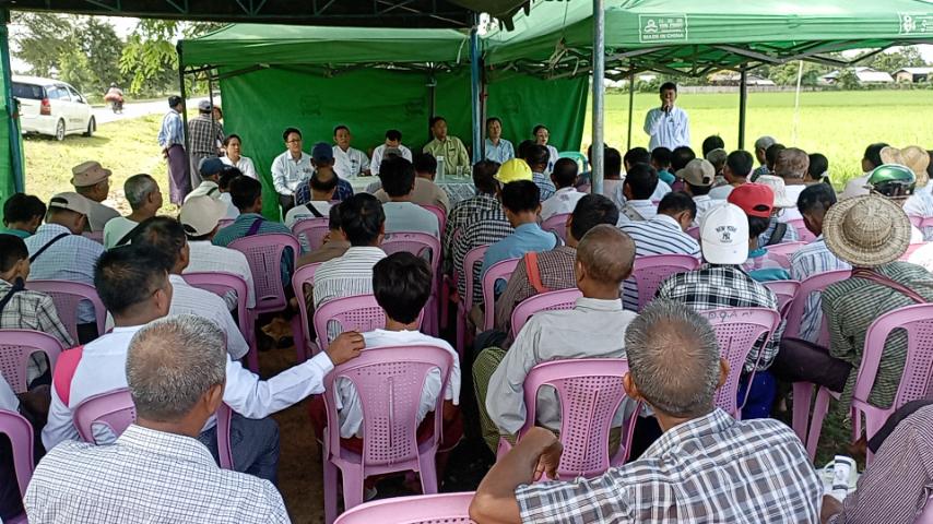 မန္တလေးတိုင်းဒေသကြီး ကျောက်ဆည်ခရိုင် မြစ်သားမြို့နယ် သီလင်ကျေးရွာအုပ်စု၊ ခန္တီးလေး ကျေးရွာနေ တောင်သူ ဦးအောင်ကျော်စိုးစံ၏ (၅)ဧကစိုက် မိုးစပါးပန်းတိုင်အထွက်နှုန်းရရှိရေး အောင်နိုင်တိုးစပါးစိုက်ခင်းတွင် မြေသြဇာ ( ၃ : ၁ ) ရောစပ် ကြဲပက်ခြင်းကွင်းသရုပ်ပြပွဲကို ယနေ့နံနက် (၁၀)နာရီက ပြုလုပ်သည်။
