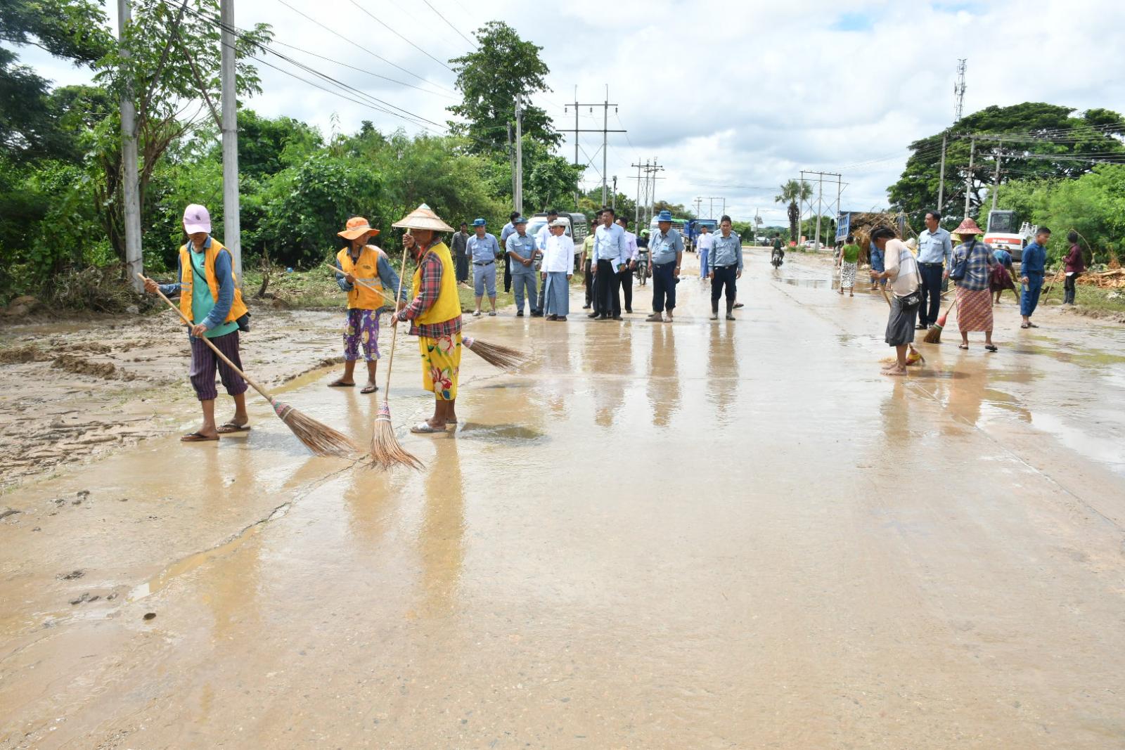 နေပြည်တော်ကောင်စီဥက္ကဋ္ဌ ဦးသန်းထွန်းဦးသည် ယမန်နေ့နံနက်ပိုင်းတွင် နေပြည်တော်ကောင်စီဝင်များ၊ နေပြည်တော်စည်ပင်သာယာရေးကော်မတီဝင်များနှင့် တာဝန်ရှိသူများနှင့်အတူ ပုဗ္ဗသီရိမြို့နယ် တပင်ရွှေထီးရပ်ကွက် သစ်တောလမ်း၌ စက်တင်ဘာလ ၂၃ ရက်နေ့ ညပိုင်းက မိုးသည်းထန်စွာရွာသွန်းပြီး လမ်းမပေါ်ရေကျော်ကာ တင်ကျန်ခဲ့သည့် နုန်းမြေများ ဖယ်ရှားရှင်းလင်းနေမှုနှင့် သန့်ရှင်းရေးဆောင်ရွက်နေမှုအား ကြည့်ရှုစစ်ဆေးခဲ့ရာ တာဝန်ရှိသူများ၏ တင်ပြချက်များအပေါ် လမ်းဘေးရေမြောင်းများ ရေစီးရေလာကောင်းမွန်စေရေးနှင့် အမှိုက်များပိတ်ဆို့မှုမရှိရေး စနစ်တကျရှင်းလင်းဖယ်ရှားရန်တို့ကို မှာကြားခဲ့သည်။
