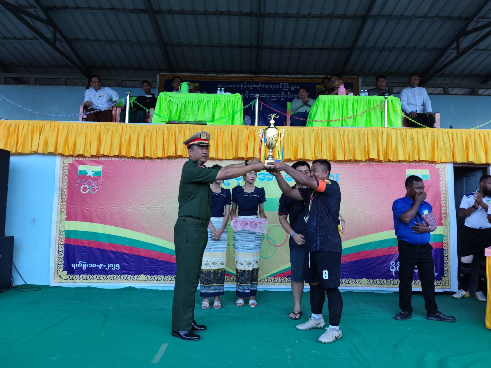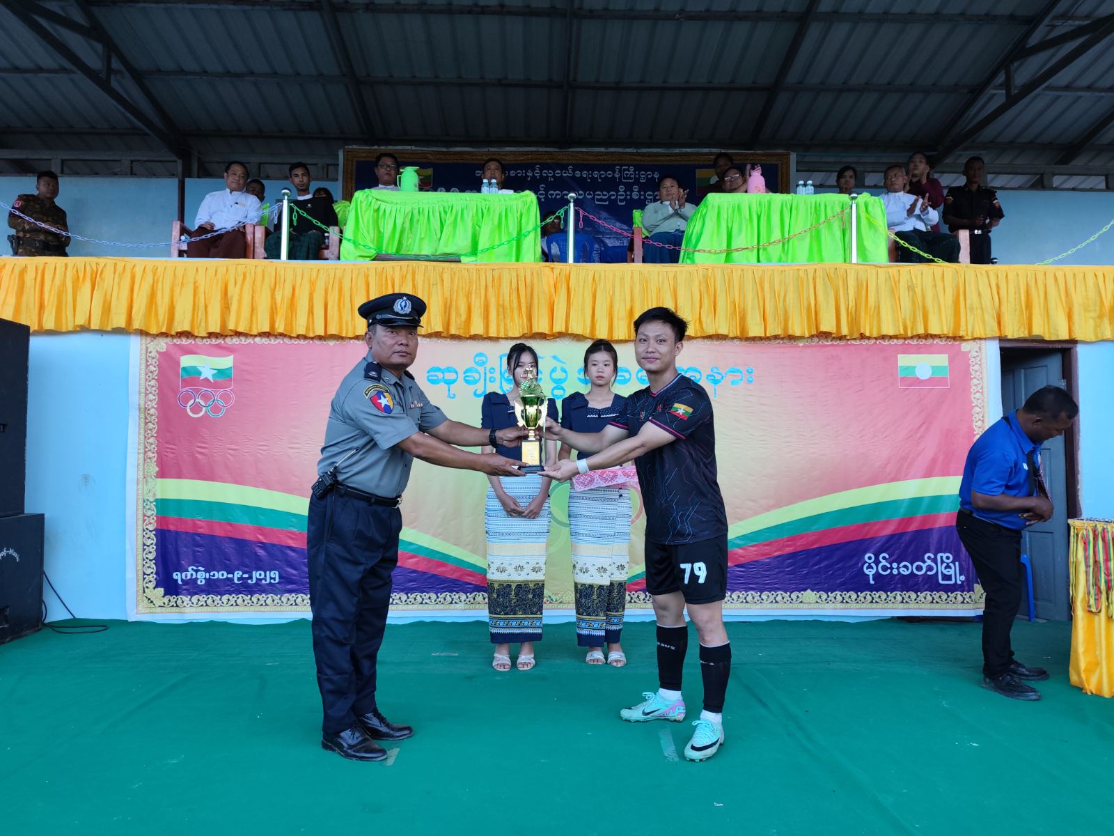 ဘောလုံးပြိုင်ပွဲနောက်ဆုံးဗိုလ်လုပွဲနှင့် ဆုချီးမြှင့်ပွဲအခမ်းအနားသို့ စစ်ဗျူဟာအဖွဲ့(အခြေချ) (မိုင်းခတ်)စစ်ဗျူဟာမှူး ဗိုလ်မှူးကြီး ဇော်အေးထွန်း၊ မြို့နယ်စီမံခန့်ခွဲရေးနှင့် အုပ်ချုပ်ရေးကော်မတီဥက္ကဋ္ဌ ဦးဟန်ဝင်းလတ်၊ မြို့နယ်ရဲတပ်ဖွဲ့မှူး ရဲမှူးအေးထွန်းနှင့် ဌာနဆိုင်ရာတာဝန်ရှိသူများက တက်ရောက်အားပေးခဲ့ကြကြောင်း သိရသည်။
