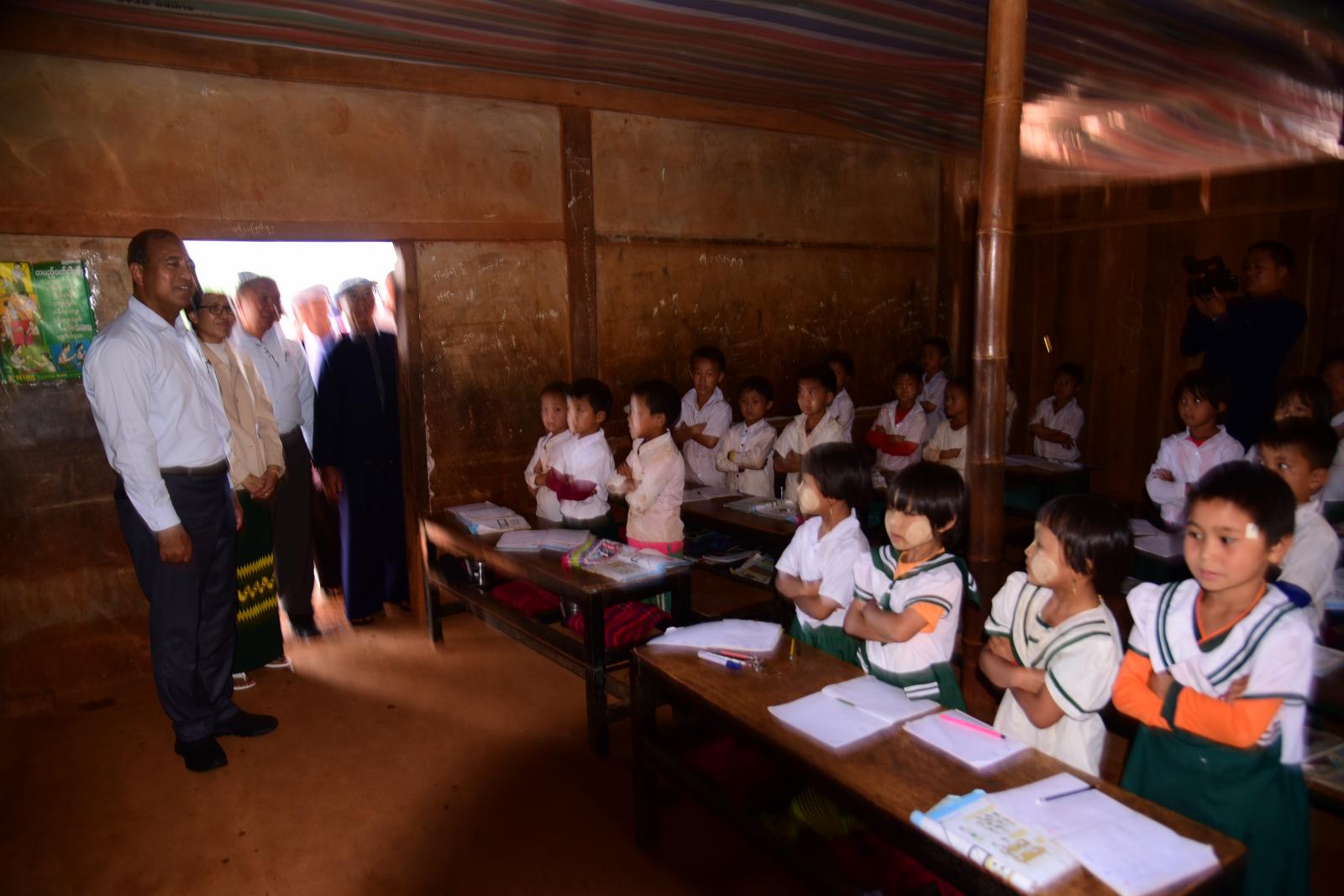ယင်းနောက် ပြည်နယ်ဝန်ကြီးချုပ်နှင့် တာဝန်ရှိသူများသည် တောင်ကြီးမြို့နယ်၊ တခေါ့မှူးကျေးရွာရှိ အခြေခံပညာမူလတန်းကျောင်းသို့ သွားရောက်၍ RCC (၁) ထပ် ကျောင်းဆောင်ဆောက်လုပ်နေမှုကို ကြည့်ရှုစစ်ဆေးရာ ပြည်နယ်ဝန်ကြီးချုပ်က တာဝန်ယူဆောက်လုပ်သည့် ပြည့်ဖြိုးကြွယ်ကုမ္ပဏီမှ တာဝန်ရှိသူအား လိုအပ်သည်များ ဖြည့်စွက်မှာကြား၍ ဆောက်လုပ်နေသည့် ကျောင်းဆောင်သစ် နောက်ကျောရှိ မြေထိန်းနံရံကို ကြည့်ရှုပြီး လိုအပ်သည်များကို ဆောင်ရွက်ရန် လမ်းဦးစီးဌာနမှ တာဝန်သူအားမှာကြားခဲ့ပြီး အေးချမ်းပျော်ရွှင်စွာ စာသင်ကြားနေသော ကျောင်းသား၊ ကျောင်းသူများအား ကြည့်ရှု၍ လိုအပ်သလို ဖြည့်ဆည်းဆောင်ရွက်ရန် တာဝန်ရှိသူအား မှာကြားခဲ့ကြောင်း သိရှိရသည်။
