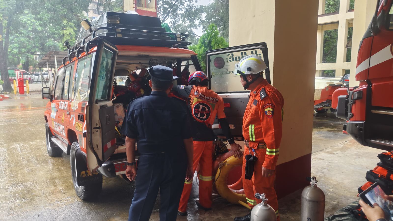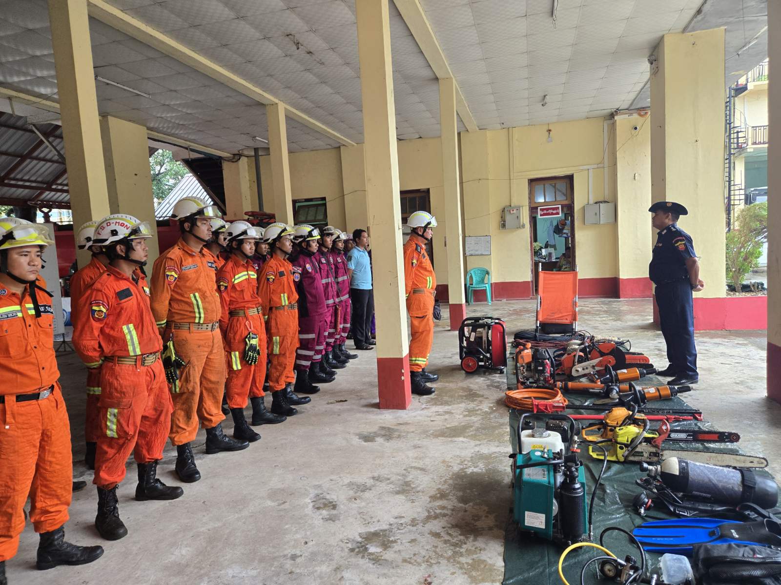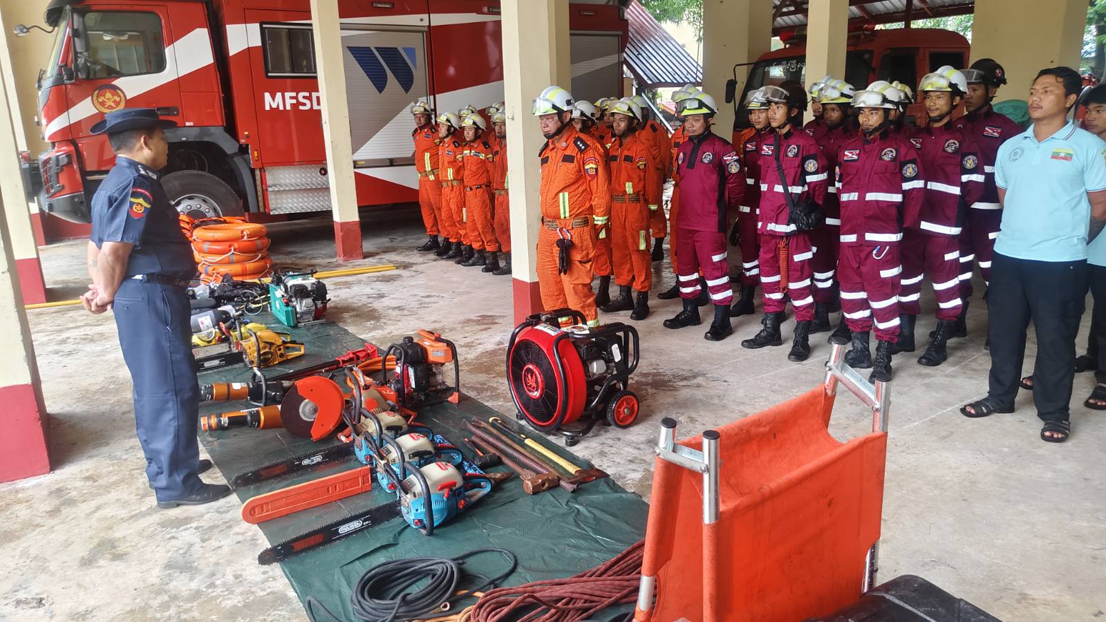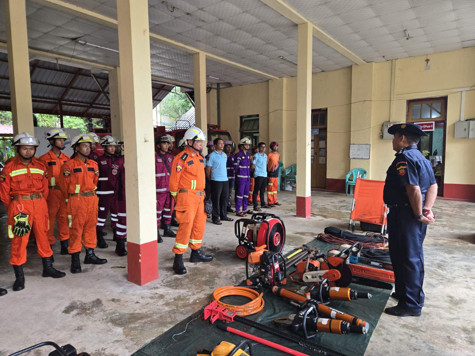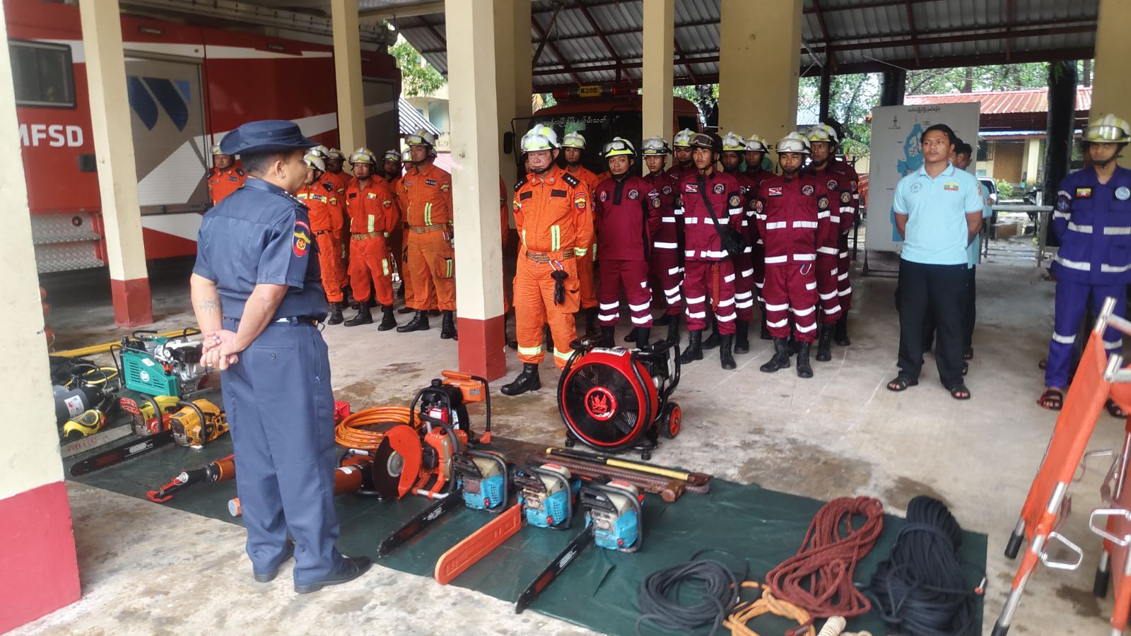 ဦးစွာ ပြည်နယ်မီးသတ်ဦးစီးမှူး ညွှန်ကြားရေးမှူး ဦးမျိုးဝင်းက ရှာဖွေကယ်ဆယ်ရေးတပ်ဖွဲ့ဝင်များ၊ ရှာဖွေကယ်ဆယ်ရေးလုပ်ငန်းသုံး ပစ္စည်းကိရိယာများနှင့် ယာဉ်/စက်များကို ကြည့်ရှုစစ်ဆေးပြီး ရှာဖွေကယ်ဆယ်ရေးတပ်ဖွဲ့ဝင်များ၏ သဘာဝဘေးအန္တရာယ် ရှာဖွေကယ်ဆယ်ရေး သဏ္ဌာန်တူဇာတ်တိုက်လေ့ကျင့်သရုပ်ပြသခြင်းကို မြို့နယ်မီးသတ်ဦးစီးမှူး ဦးစိုးကျော်သူ ဦးဆောင်၍ လူမူကယ်ဆယ်ရေးအဖွဲ့များ၊ ကြက်ခြေနီတပ်ဖွဲ့များဖြင့် သဘာဝဘေးဖြစ်ပေါ်လာပါက အချိန်နဲ့တပြေးညီ ကူညီဆောင်ရွက် ရေးလုပ်ငန်းများ ပူးပေါင်းဆောင်ရွက်နိုင်ရန် စုဖွဲ့လေ့ကျင့်ခဲ့ကြကြောင်း သိရှိရသည်။