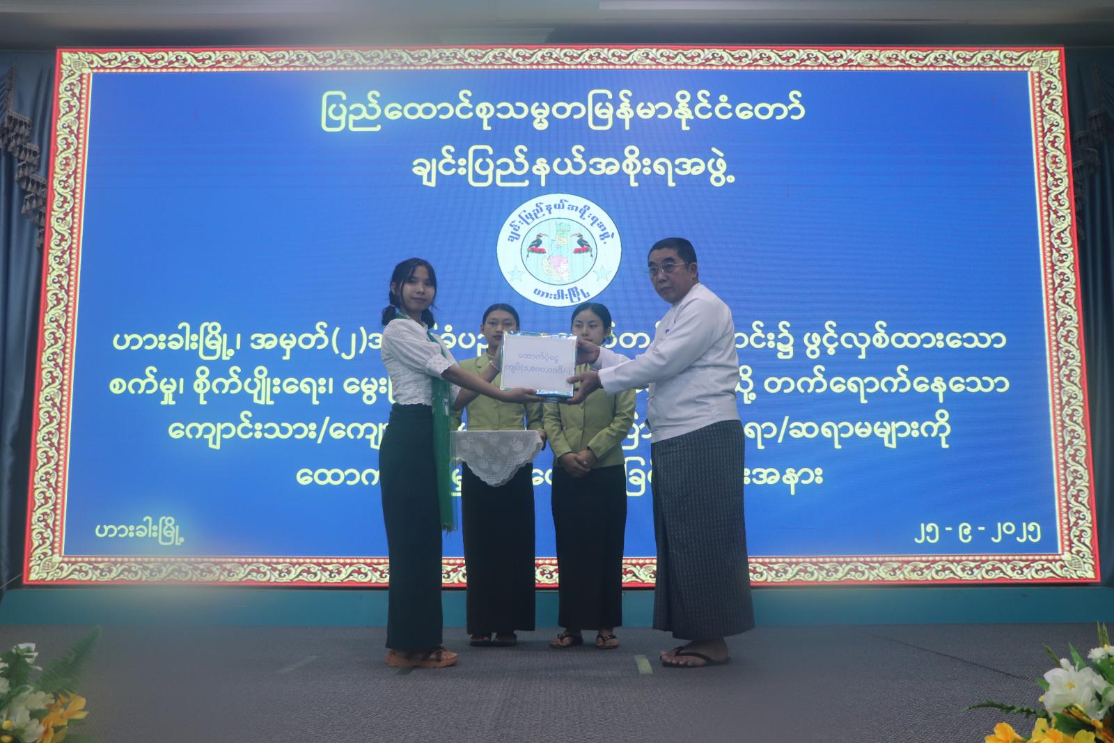 ထို့နောက် ဟားခါးမြို့ အမှတ် (၂) အခြေခံပညာအထက်တန်းကျောင်းရှိ စက်မှု၊ စိုက်ပျိုး၊ မွေးမြူရေးအထက်တန်းကျောင်းတွင် ပညာသင်ကြားနေသော Grade-10 ၊ Grade-11 နှင့် Grade-12 ကျောင်းသား၊ ကျောင်းသူ (၇၈) ယောက်အတွက် တစ်ဦးလျှင် ကျပ် ၁၀၀,၀၀၀ နှုန်းဖြင့် ကျပ် ၇၈ သိန်း ကို ပြည်နယ်ဝန်ကြီးချုပ်ကလည်းကောင်း ၊ အမှတ် ( ၂ ) အခြေခံပညာအထက်တန်းကျောင်းရှိ စက်မှု၊ စိုက်ပျိုး၊ မွေးမြူရေးအထက်တန်းကျောင်းတွင် ပညာသင်ကြားပေးနေသော ဆရာ၊ ဆရာမများ အတွက် ကျပ် ၃၃ သိန်းကို ပြည်နယ်အမျိုးသမီးရေးရာအဖွဲ့နာယက ပြည်နယ်ဝန်ကြီးချုပ်၏ ဇနီး ဒေါ်ဒိမ်ခန်လွင်ကလည်းကောင်း ပေးအပ်ချီးမြှင့်ကြသည်။