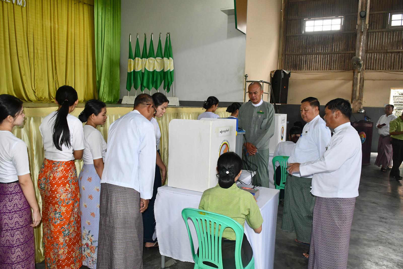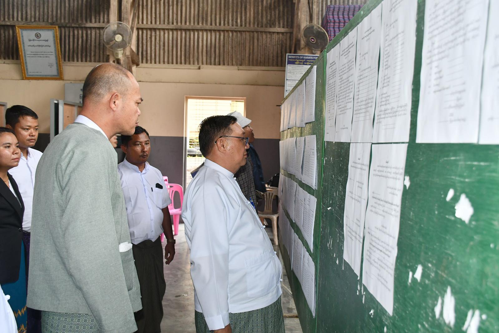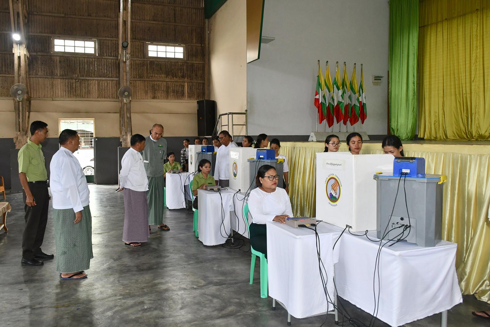 ဆက်လက်၍ ပြည်ထောင်စုရွေးကောက်ပွဲကော်မရှင်အဖွဲ့ဝင်နှင့် တာဝန်ရှိသူများသည် အ.ထ.က(၁)မြိတ် ပညာ့ဗိမာန်ခန်းမတွင် မြို့နယ်ရွေးကောက်ပွဲကော်မရှင်အဖွဲ့ခွဲမှ မြန်မာအီလက်ထရောနစ် မဲပေးစက်ဖြင့် မဲပေးခြင်းလုပ်ငန်းစဉ်များအတိုင်း ရပ်ကွက်ကော်မရှင်အဖွဲ့ခွဲများ၊ မဲဆန္ဒရှင်ပြည်သူများကို အသိပညာပေးခြင်းနှင့် လက်တွေ့သရုပ်ပြစမ်းသပ်မဲပေးခြင်း ဆောင်ရွက်နေမှုအား ကြည့်ရှုအားပေးကြပြီး လိုအပ်သည်များကို လမ်းညွှန်မှာကြား၍ ရပ်ကွက်/ကျေးရွာများအလိုက် မဲဆန္ဒရှင်စာရင်း ကြေညာမည့်ပုံစံအား ကြည့်ရှုစစ်ဆေးခဲ့ကြောင်း သိရသည်။