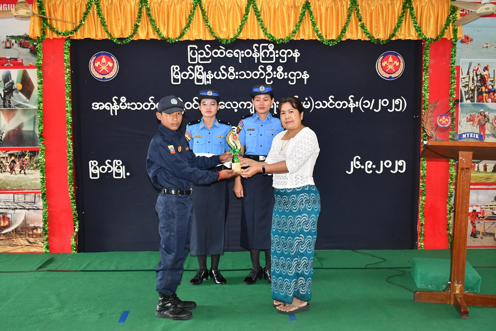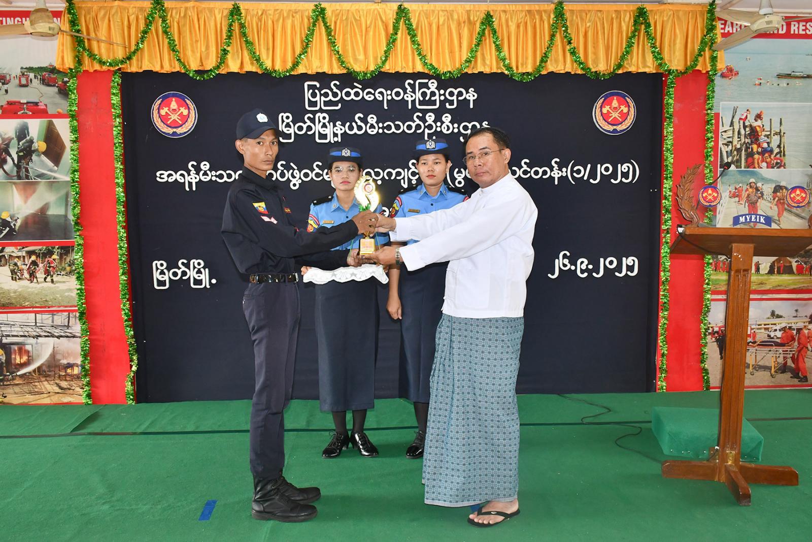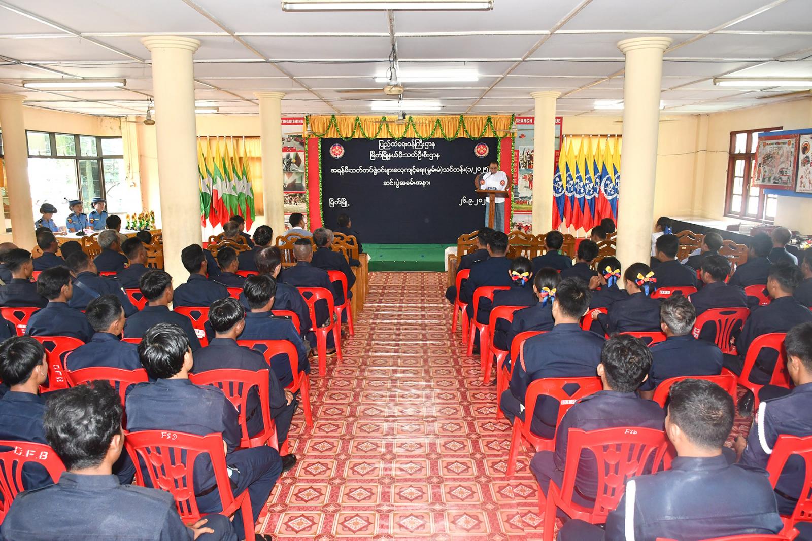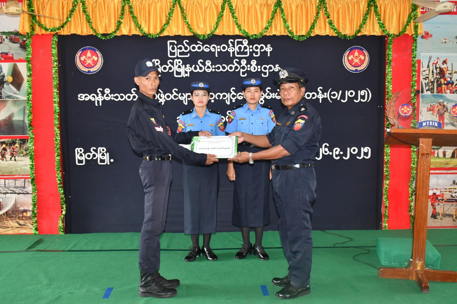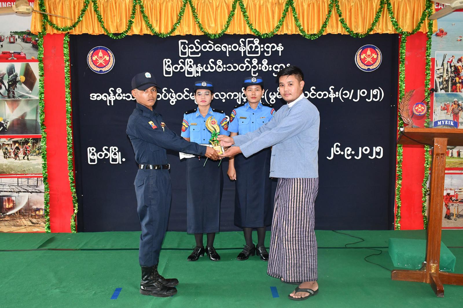 သင်တန်းဆင်းပွဲတွင် မြို့နယ်စီမံခန့်ခွဲရေးနှင့်အုပ်ချုပ်ရေးကော်မတီအဖွဲ့ဝင် ဦးသောင်းအေးက သင်တန်းဆင်းအမှာစကား ပြောကြားသည်။ ထို့နောက် သင်တန်းတစ်လျှောက် အကောင်းဆုံးဆု၊ မီးငြှိမ်းသတ်ရေးပညာတွင် အကောင်းဆုံးဆု၊ ရှာဖွေကယ်ဆယ်ရေးပညာရပ်တွင် အကောင်းဆုံးဆုရရှိသော သင်တန်းသားများနှင့် သင်တန်း ဆင်းလက်မှတ်များကို မြို့နယ်စီမံခန့်ခွဲရေးနှင့်အုပ်ချုပ်ရေးကော်မတီအဖွဲ့ဝင်နှင့် တာဝန်ရှိသူများက ဆုများအသီးသီး ပေးအပ်ချီးမြှင့်ကြသည်။
