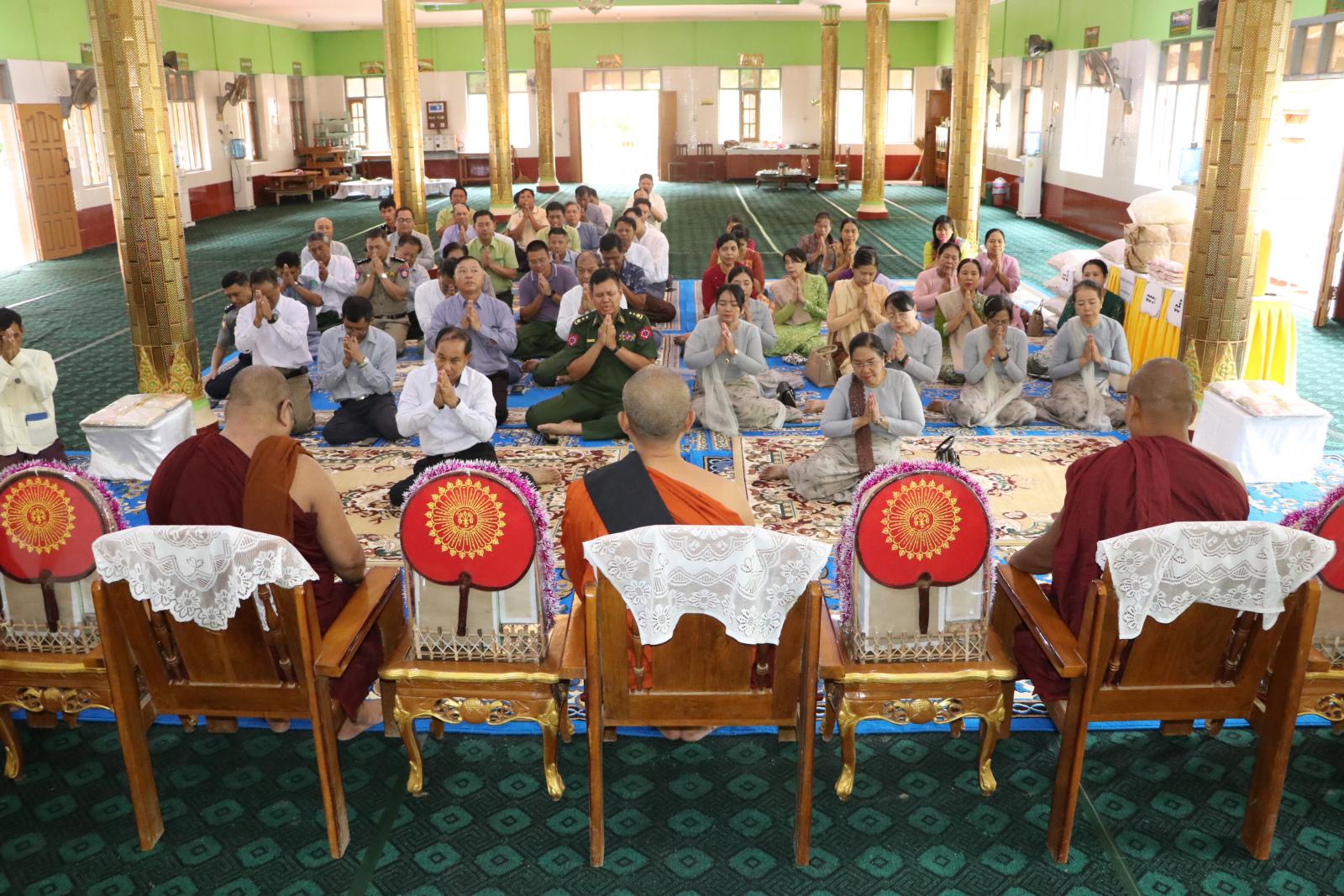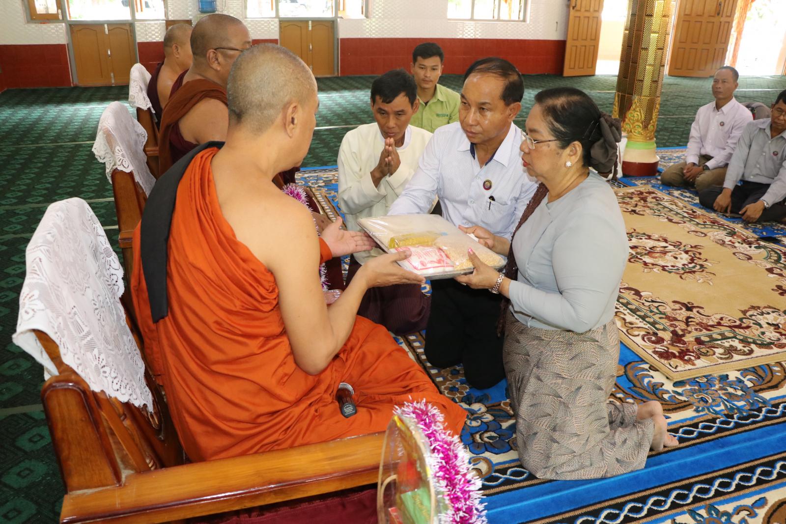 ဆက်လက်ပြီး တိုင်းဒေသကြီး ဝန်ကြီးချုပ်နှင့်တာဝန်ရှိသူများသည် မုံရွာမြို့ပေါ်ရှိ ဘုန်းတော်ကြီးကျောင်းတိုက်များရှိ ဆရာတော်/သံဃာတော်များ ဆွမ်းကွမ်းအခက်အခဲမရှိ စေရေးတို့အတွက် စစ်ကိုင်းတိုင်းဒေသကြီးအစိုးရအဖွဲ့မှ လှူဖွယ်ဝထ္တုပစ္စည်းများ၊ ဆေးနှင့် ဆွမ်းဆန်၊ ဆီ၊ ဆား၊ ပဲများ ဆက်ကပ်လှူဒါန်းခြင်းကို မုံရွာမြို့၊ လယ်တီရပ်ကွက်ရှိအရှေ့ လယ်တီကျောင်းတိုက်ကြီးတွင် ကျင်းပရာ မုံရွာမြို့၊ အရှေ့လယ်တီကျောင်းတိုက်ကြီး၏ ဦးစီးပဓာန နာယက ဘဒ္ဒန္တပုညသေဌ ဆရာတော်ကြီးထံမှ တိုင်းဒေသကြီးဝန်ကြီးချုပ်နှင့် ဧည့်ပရိတ်သတ်များက ငါးပါးသီလခံ ယူဆောက်တည်ကြသည်။