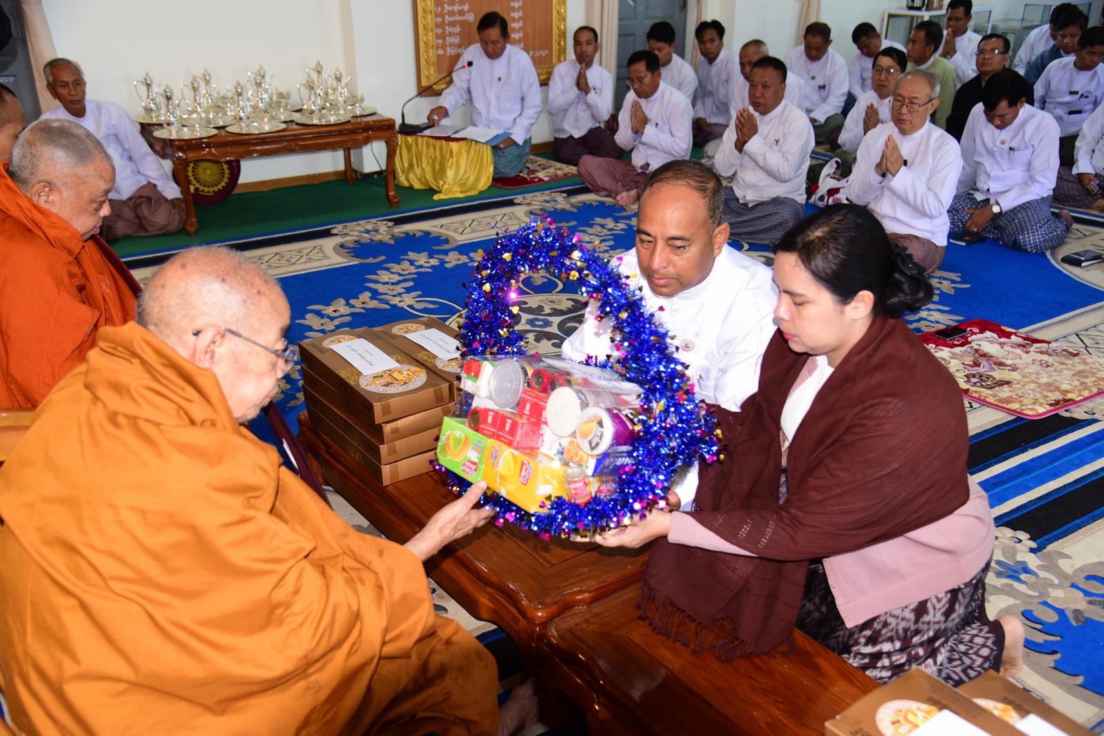 ယင်းနောက် တောင်ကြီးမြို့ သိမ်တောင်ကျောင်းတိုက်မှ အရှင်တိလောက က ပဋ္ဌာန်းအောင်ဂါထာကို ရွတ်ဖတ်ပူဇော်ပြီး ပြည်နယ်ဝန်ကြီးချုပ် ဦးအောင်အောင်နှင့်ဇနီး၊ ပြည်နယ်တရားလွှတ်တော်တရားသူကြီးချုပ်နှင့်ဇနီး၊ ပြည်နယ်ဝန်ကြီးများ၊ ပြည်နယ်ဥပဒေချုပ်တို့က ဆရာတော်၊ သံဃာတော်အရှင်သူမြတ်များအား လှူဖွယ်ဝတ္ထုပစ္စည်းများ ဆက်ကပ်လှူဒါန်းကြသည်။