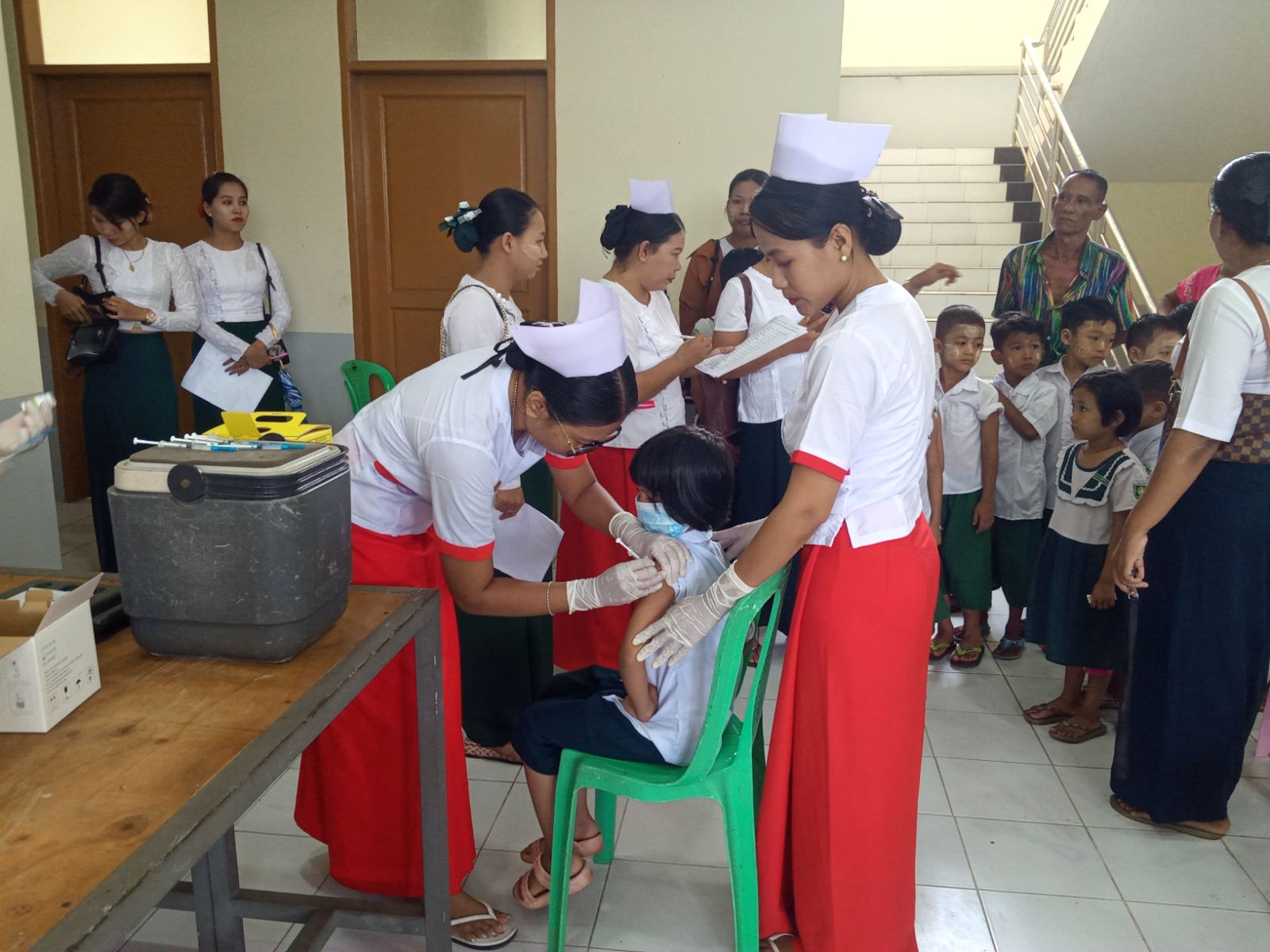 အဆိုပါကာကွယ်ဆေးအား မြို့နယ်ကုသရေးနှင့်ပြည်သူ့ကျန်းမာရေးဦးစီးဌာနမှူး ဒေါက်တာခွန်မောင်အိုးမှကြီးကြပ်၍ ကျန်းမာရေးဝန်ထမ်းများက အသက်(၅)နှစ်မှ(၇)နှစ်အတွင်း ကျောင်းသားများအား ဆုံဆို့၊ မေးခိုင်(DT) ကာကွယ်ဆေးကို ထိုးနှံပေးခဲ့သည်။