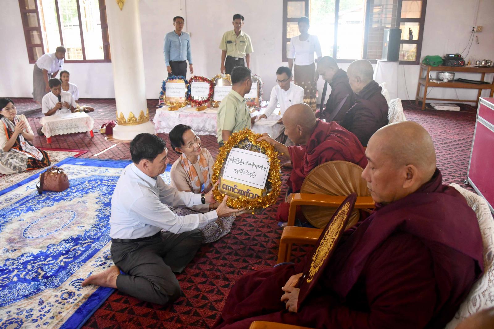 ဦးစွာ ပြည်နယ်ဝန်ကြီးချုပ်နှင့်အဖွဲ့သည် ကျောက်ဖြူမြို့၊ နဂါးကျောင်း ပရိယတ္တိစာသင်တိုက်၌ ကျောက်ဖြူမြို့ပေါ်ရှိ ဆရာတော်ကြီးများအား သွားရောက်ဖူးမြော်ကြပြီး ဝါဆိုသင်္ကန်း၊ ဆွမ်းဆန်တော်၊ ဆီနှင့်လှူဖွယ်ဝတ္ထုပစ္စည်းများ ဆက်ကပ်လှူဒါန်းကြရာ မြို့နယ်သံဃနာယကအဖွဲ့ဥက္ကဋ္ဌ၊ ဓမ္မဆာယာကျောင်းတိုက်ဆရာတော်ဘဒ္ဒန္တစန္ဒာဝရထံမှ ပြည်နယ်ဝန်ကြီးချုပ်အမှူးပြုသော ဧည့်ပရိတ်သတ်များက ငါးပါးသီလခံယူ ဆောက်တည်ကြသည်။