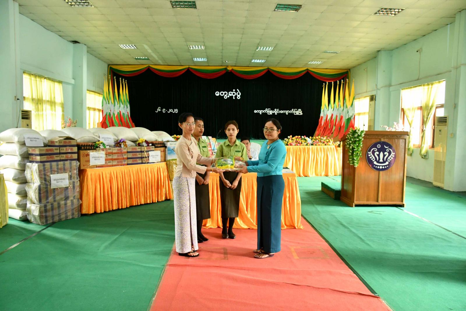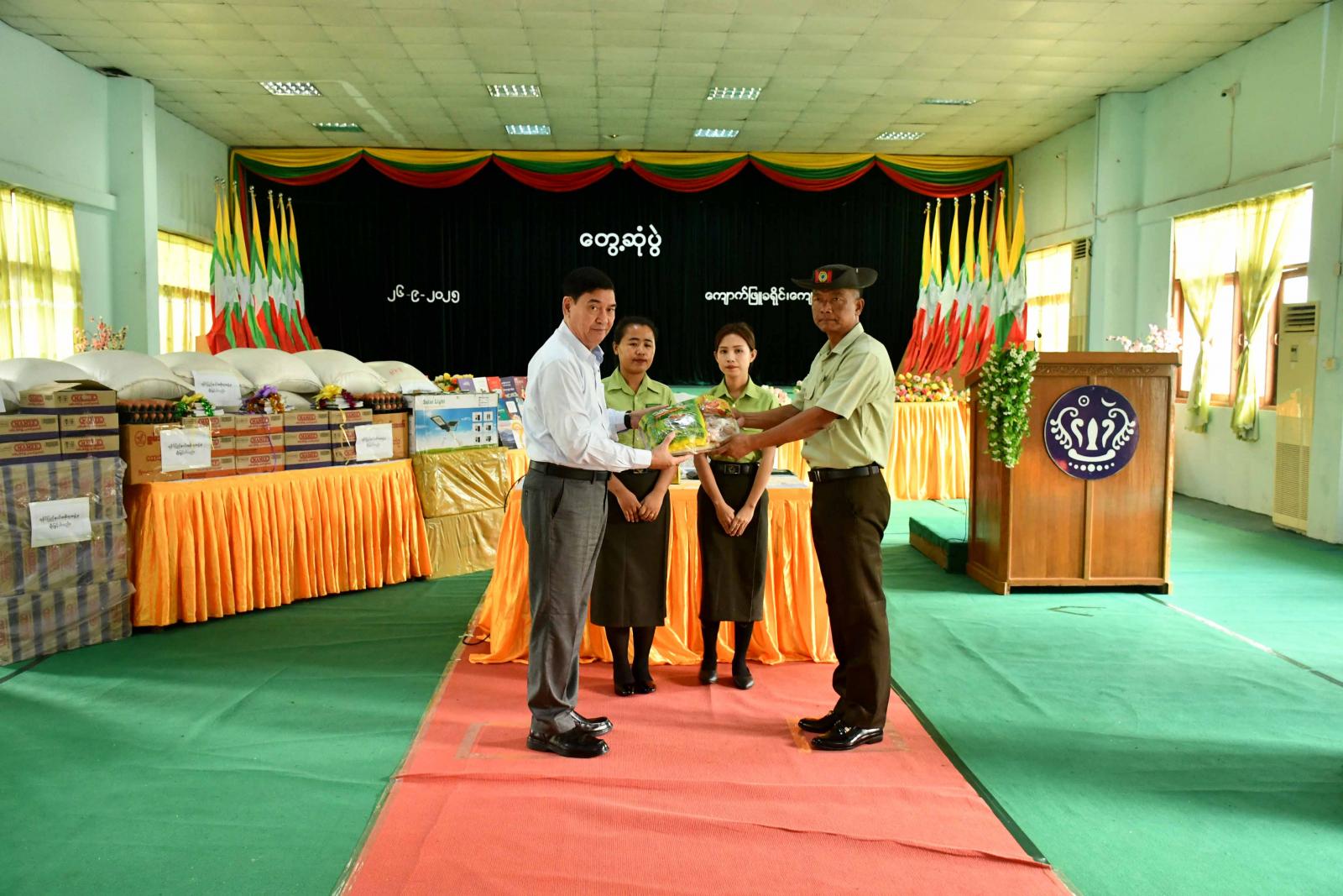 ထို့နောက် ပြည်နယ်ဝန်ကြီးချုပ် ဦးထိန်လင်းနှင့်ဇနီး၊ ပြည်နယ်တရားလွှတ်တော် တရားသူကြီးချုပ်၊ ပြည်နယ်အစိုးရအဖွဲ့ဝင်များက ခရိုင်နှင့်မြို့နယ်အဆင့်ဌာနဆိုင်ရာများသို့ ဆန်နှင့်အခြေခံစားသောက်ကုန်များ ပေးအပ်ချီးမြှင့်ကြပြီး ကျောက်ဖြူမြို့ပေါ်တွင် ဆိုလာစနစ်ဖြင့် လမ်းမီးများရရှိနိုင်ရေးအတွက် ဆိုလာမီးများ၊ စာကြည့်တိုက်များ ဖွံ့ဖြိုးတိုးတက်ရေးအတွက် သုတရသစာအုပ်များကို ပေးအပ်ကြသည်။
