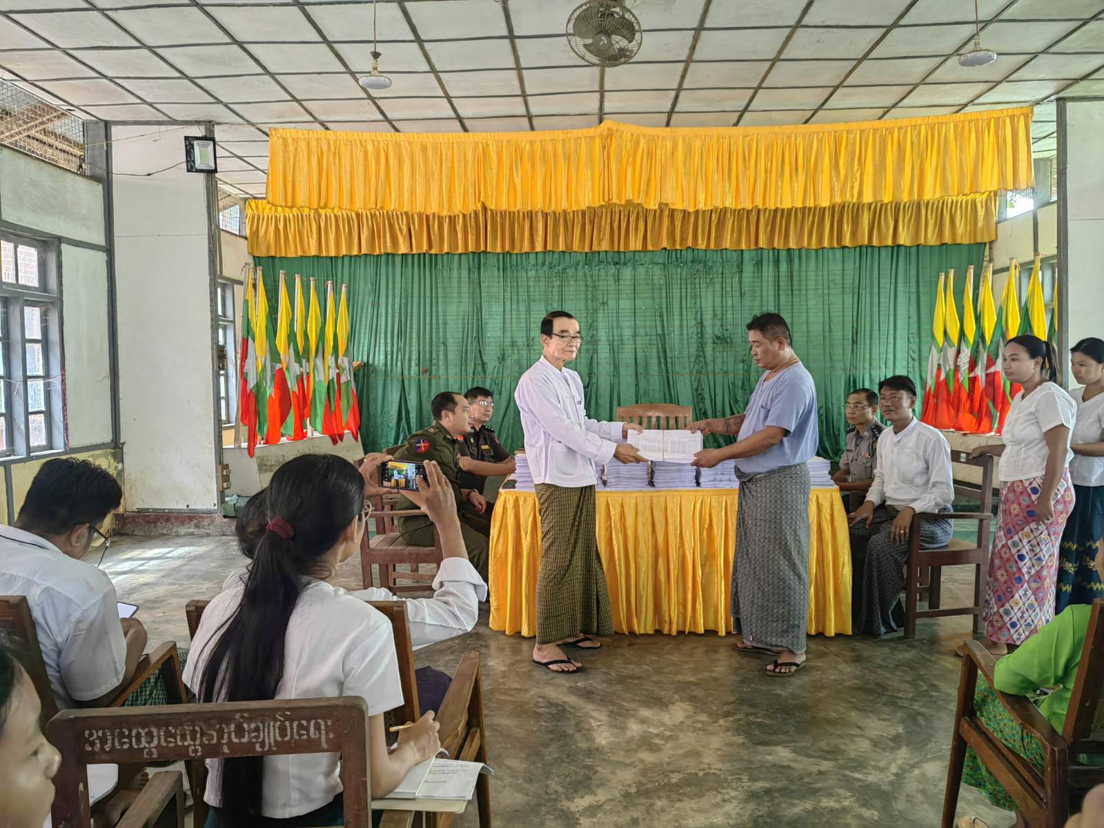 ထို့နောက် မြို့နယ်ရွေးကောက်ပွဲကော်မရှင်အဖွဲ့ခွဲရုံးမှ ဦးစီးအရာရှိ ဒေါ်မေလမင်းထွန်းမှ မဲစာရင်းပုံစံများအား ရှင်းလင်းပြောကြားပြီး ပုံစံ - ၁ မဲစာရင်းများအား သက်ဆိုင်ရာ မဲရုံများအလိုက် တာဝန်ရှိသူများမှ ပေးအပ်ခဲ့ကြောင်း သိရသည်။
