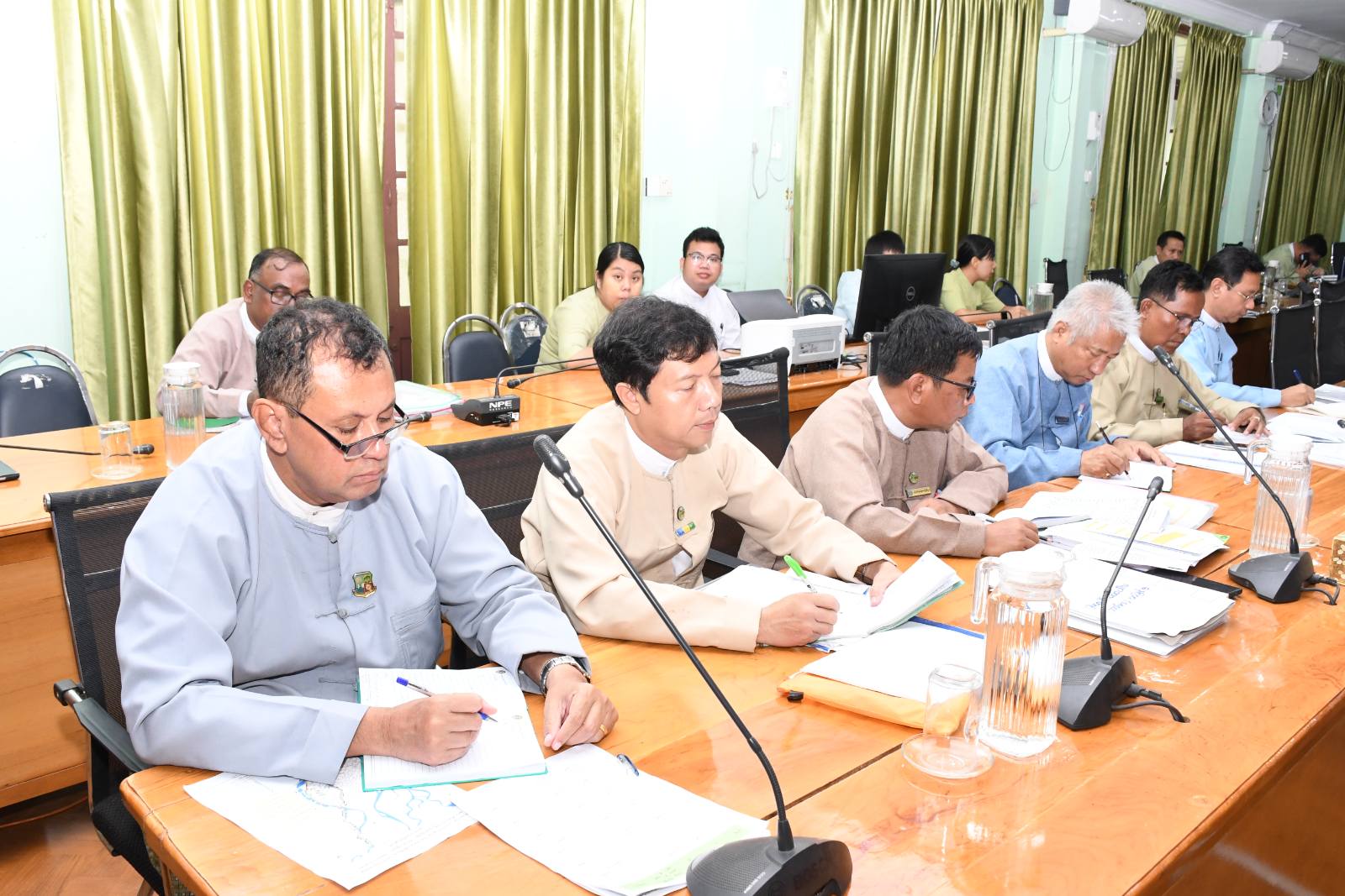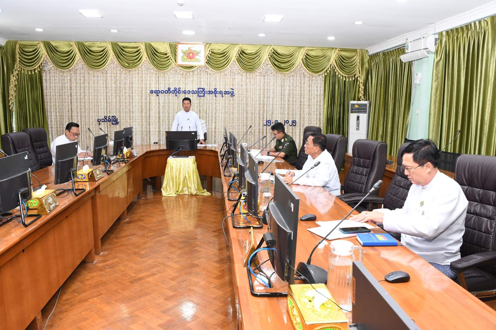 ဧရာဝတီတိုင်းဒေသကြီးအစိုးရအဖွဲ့ရုံး၊ အစည်းအဝေးခန်းမ (၁) တွင် စိုက်ပျိုးထုတ်လုပ်မှု တိုးတက်မြင့်မားရေး လုပ်ငန်းညှိနှိုင်းအစည်းအဝေးကို ယနေ့နံနက်ပိုင်းကပြုလုပ်ခဲ့ရာ အစည်းအဝေးသို့ တိုင်းဒေသကြီးဝန်ကြီးချုပ်ဦးတင်မောင်ဝင်း၊ အစိုးရအဖွဲ့ဝင်ဝန်ကြီးများနှင့် တိုင်းဒေသကြီးစိုက်ပျိုးထုတ်လုပ်မှုတိုးတက်မြင့်မားရေးလုပ်ငန်း ကြီးကြပ်မှုကော်မတီဝင် ဌာနဆိုင်ရာများတက်ရောက်ခဲ့ကြပြီး ခရိုင်၊ မြို့နယ် စိုက်ပျိုးထုတ်လုပ်မှုတိုးတက်မြင့်မားရေး လုပ်ငန်းကြီးကြပ်မှုကော်မတီဥက္ကဋ္ဌများက Video Conferencing ဖြင့် တက်ရောက်ခဲ့ကြသည်။