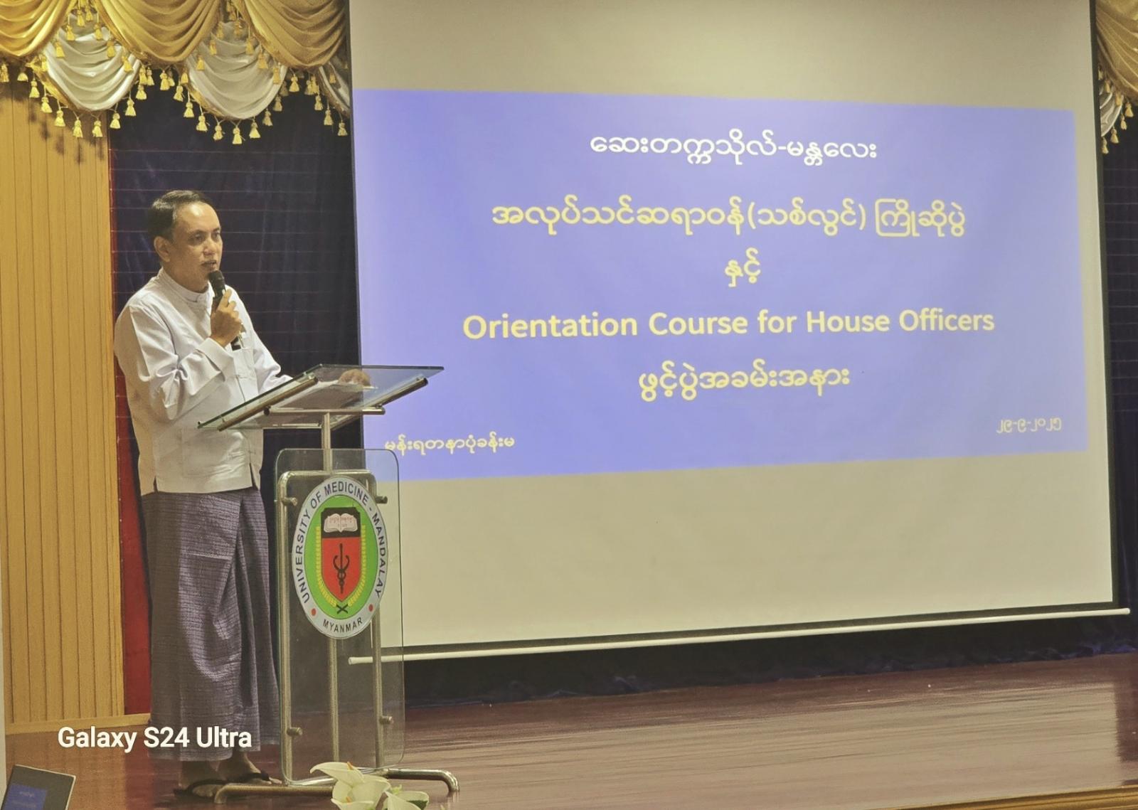 ကျန်းမာရေးဝန်ကြီးဌာန၊ ကျန်းမာရေးလူ့စွမ်းအားအရင်းအမြစ်ဦးစီးဌာန၊ ဆေးတက္ကသိုလ်-မန္တလေး အလုပ်သင်ဆရာဝန်(သစ်လွင်)ကြိုဆိုပွဲနှင့် Orientation Course For House Officers ဖွင့်ပွဲအခမ်းအနားကို စက်တင်ဘာလ ၂၉ ရက်နေ့ နံနက် ၁၀ နာရီက မန္တလေး၊ ချမ်းအေးသာစံ မြို့နယ်၊ လမ်း ၃၀ × ၇၃ လမ်းရှိ ဆေးတက္ကသိုလ်-မန္တလေး၊ မန်းရတနာပုံ(ဇီဝက)ခန်းမတွင် ကျင်းပခဲ့သည်။