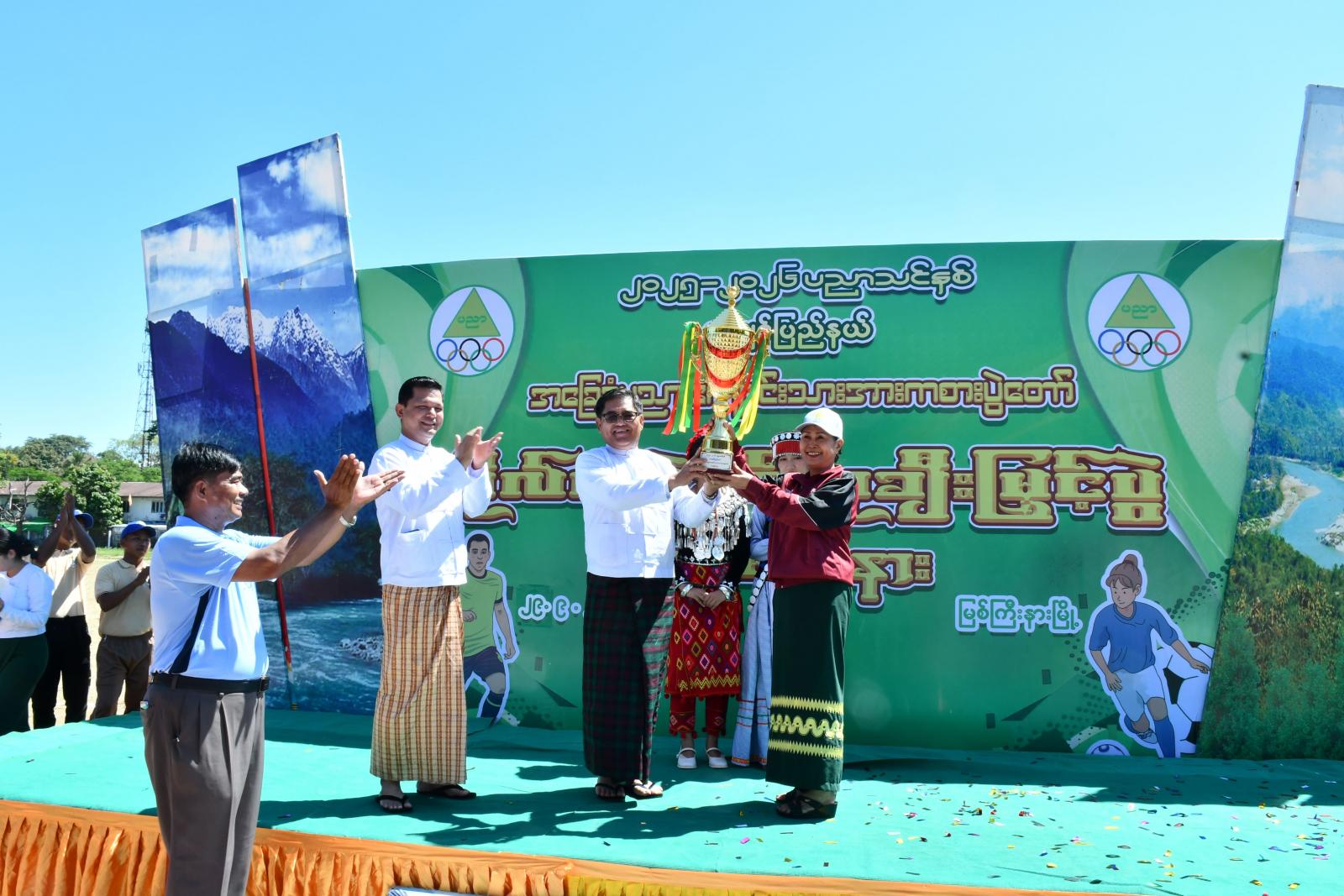 ဆက်လက်၍ ဆုချီးမြှင့်ပွဲ အခမ်းအနားကို ဆက်လက်ကျင်းပရာ အမျိုးသမီးဘောလုံးပြိုင်ပွဲ တွင် နေရာအလိုက် အကောင်းဆုံးဆု၊ ပွဲစဉ်တစ်လျှောက် အကောင်းဆုံးဆုရကစားသမားများနှင့် ပထမ၊ ဒုတိယဆုရ အသင်းများအား ပြည်နယ်တရားလွှတ်တော်တရားသူကြီးချုပ်နှင့် ပြည်နယ် ဝန်ကြီးချုပ်၏ ဇနီးဒေါ်နန်ဆိုင်းတို့က လည်းကောင်း၊ အမျိုးသားဘောလုံးပြိုင်ပွဲတွင် ဒုတိယဆုရ အသင်းအား ပြည်နယ်လူမှုရေးရာဝန်ကြီးက လည်းကောင်း၊ နေရာအလိုက် အကောင်းဆုံးဆု၊ ပွဲစဉ် တစ်လျှောက် အကောင်းဆုံးဆုရကစားသမားများနှင့် ပထမရရှိသော ဝိုင်းမော်မြို့နယ်အသင်းတို့ အား ပြည်နယ်ဝန်ကြီးချုပ်က လည်းကောင်း တစ်ဦးချင်းလည်ဆွဲဆုတံဆိပ်၊ ဂုဏ်ပြုဆုတံဆိပ်၊ ဂုဏ်ပြုချီးမြှင့်ငွေနှင့် တံခွန်စိုက်ဒိုင်းဆုတို့အား အသီးသီးပေးအပ်ချီးမြှင့်ခဲ့ကြကြောင်း သိရသည်။