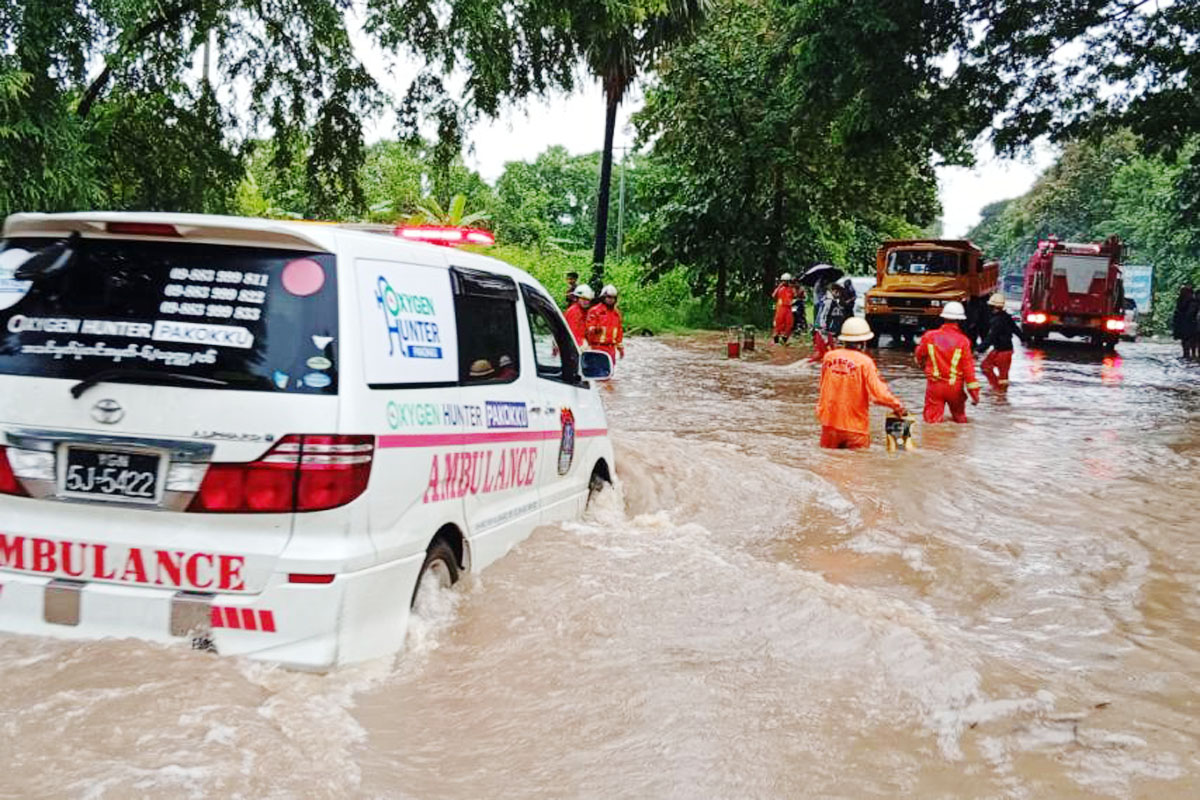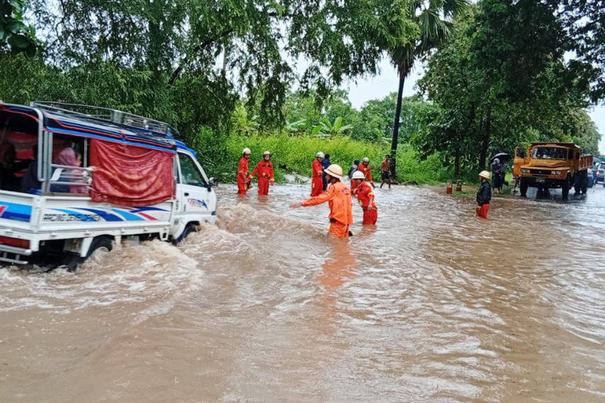 အဆိုပါ ရေကျော်ချောင်းရိုးများ ကားလမ်းပိတ်ဆို့မှုဖြစ်ပေါ်ရာသို့ မြို့နယ်မီးသတ်ဦးစီးမှူး ဦးသန်းမြင့်ဦးဆောင်သည့် မီးသတ်တပ်ဖွဲ့ဝင် သန္ဓေ(၁+၁၀)ဦး အရန်မီးသတ်(၃)ဦး ပေါင်း၁၄ ဦးနှင့် မြန်မာ နိုင်ငံရဲတပ်ဖွဲ့ဝင်များ၊ လုံခြုံရေးတပ်ဖွဲ့ဝင်များက ရေကြောင်းလမ်းပြ ကူညီကယ်ဆယ်မှုများဆောင်ရွက်လျက်ရှိပြီး၊ မြို့နယ်စီမံခန့်ခွဲရေးနှင့်အုပ်ချုပ်ရေးကော်မတီဥက္ကဋ္ဌ၊ မြို့နယ်အုပ်ချုပ်ရေးမှူး ဦးသန်းလွင်နှင့် ဆည်မြောင်းနှင့်ရေအသုံးချမှု စီမံခန့်ခွဲရေးဦးစီးဌာန မြို့နယ်ဦးစီးမှူး ဦးကျော်ဆွေဝင်း၊ လမ်းဦးစီးဌာန မြို့နယ်ဦးစီးမှူး ဦးထွန်းအောင်ကြင်တို့မှ အနီးကပ်ကြီးကြပ်ဆောင်ရွက်လျက်ရှိကြောင်းသိရပြီး ညနေ (၃:၄၀) နာရီတွင် ရေအနည်းငယ်ကျဆင်းသွားပြီဖြစ်၍ ယာဉ်အသွားအလာများ ပုံမှတ်အတိုင်းဖြတ်ကျော်မောင်းနှင်လျက်ရှိကြောင်း သိရသည်။