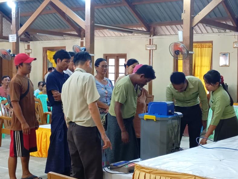 ဧရာဝတီတိုင်းဒေသကြီး၊ မြန်အောင်ခရိုင်၊ အင်္ဂပူမြို့နယ်တွင်အကြမ်းဖက်ဖြစ်စဉ်များကြောင့် နေရပ်စွန့်ခွာပြည်သူများအား မဲပေးစက်ဆိုင်ရာအသိပညာပေးခြင်းနှင့် လက်တွေ့ စမ်းသပ်မဲပေးခြင်းကို စက်တင်ဘာ ၂၉ ရက်နေ့ နေ့လည်ပိုင်းက မြို့နယ်အထွေထွေအုပ်ချုပ်ရေးဦးစီးဌာန အစည်းအဝေးခန်းမ၌ ပြုလုပ်ခဲ့သည်။