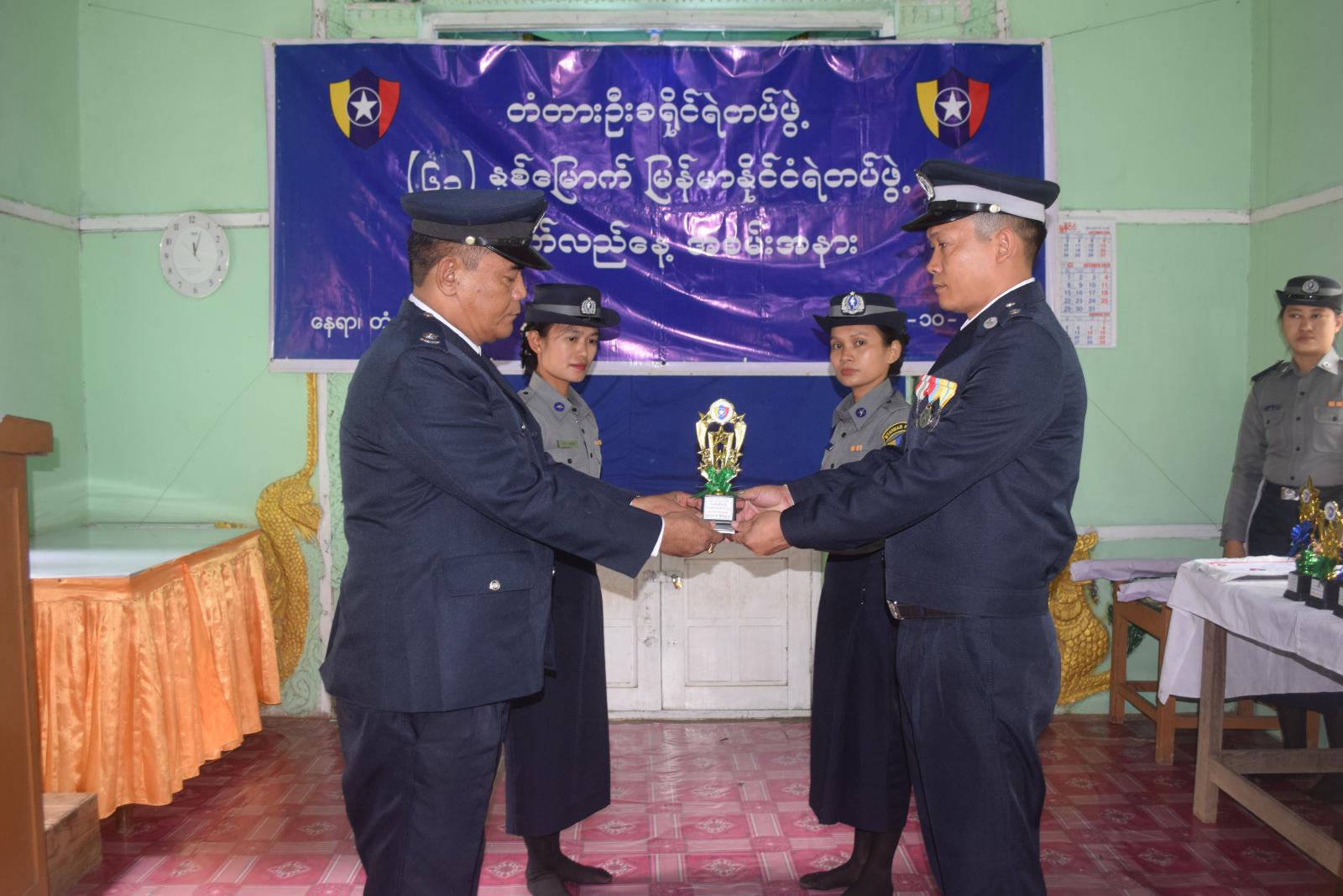 အခမ်းအနားတွင် ခရိုင်ရဲတပ်ဖွဲ့မှူး ဒုတိယရဲမှူးကြီး ခင်မောင်ဇော်မှ မြန်မာနိုင်ငံရဲတပ်ဖွဲ့ ရဲချုပ်ထံမှ ပေးပို့သည့် (၆၁)မြောက်မြန်မာနိုင်ငံရဲတပ်ဖွဲ့နေ့ သဝဏ်လွှာအားဖတ်ကြားသည်။ ထို့နောက် ခရိုင်အတွင်းရှိ ရဲစခန်းများမှ ကြိုးစားအားထုတ်မှု၊ မှုခင်းဖော်ထုတ်ဖမ်းဆီရရှိမှု ပြေးလေးပြေး ဖော်ထုတ်ရရှိမှုအစရှိသော ဆုရရှိသည့် ရဲတပ်ဖွဲ့ဝင်များကို ခရိုင်ရဲတပ်ဖွဲ့မှူးနှင့် တာဝန်ရှိသူများက ဆုများချီးမြှင့်ပေးအပ်သည်။ ဆက်လက်၍ ခရိုင်မိသားစုစည်းရုံးရေးနှင့် စည်းကမ်းထိန်းသိမ်းရေး ဆိုင်ရာနှင့်ပတ်သက်သည့် ဆုများကို ရဲတပ်ဖွဲ့ဝင်ဇနီးများကို ခရိုင်မိသားစုစည်းရုံးရေးနှင့် စည်းကမ်းထိန်းသိမ်းရေးဆိုင်ရာကော်မတီ ဥက္ကဋ္ဌ နှင့် တာဝန်ရှိသူများက ပေးအပ်သည်။ ထို့နောက် ခရိုင်ရဲတပ်ဖွဲ့မှူး ဒုတိယရဲမှူးကြီးခင်မောင်ဇော်မှ မှုခင်းဖော်ထုတ်ရာတွင် ပါဝင်ကူညီဆောင်ရွက်ခဲ့ကြ သူများနှင့် ရဲမှုထမ်းဟောင်းများအား အမှတ်တရလက်ဆောင် ပစ္စည်းများ ပေးအပ်ကြောင်းသိရသည်။
