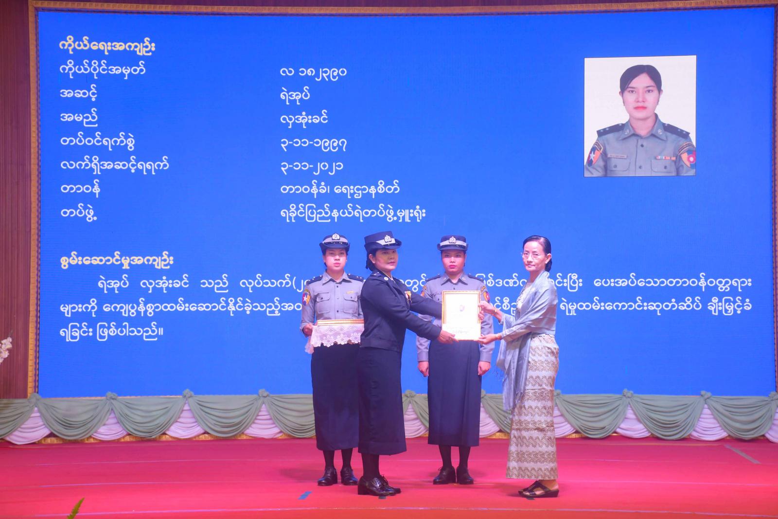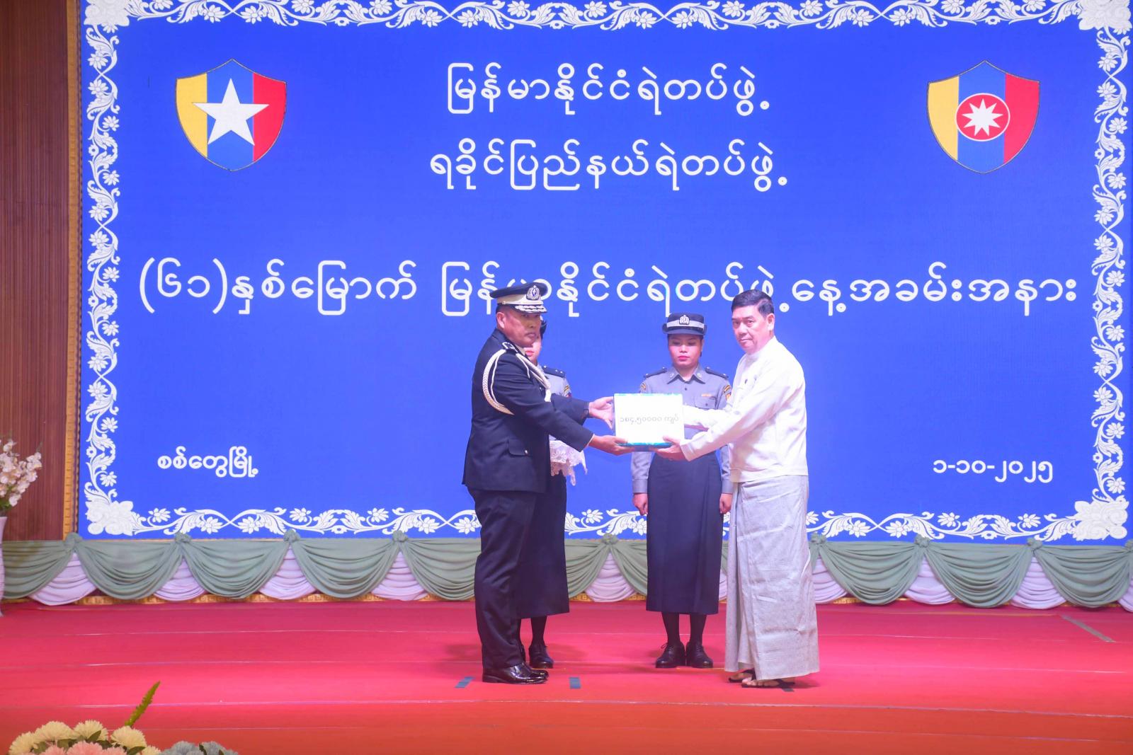 ဆက်လက်၍ နှစ်(၆၁)ပြည့် မြန်မာနိုင်ငံရဲတပ်နေ့အခမ်းအနားသို့ ရဲချုပ်မှပေးပို့သည့် သဝဏ်လွှာ အား ရခိုင်ပြည်နယ် ရဲတပ်ဖွဲ့မှူး ရဲမှူးကြီး သက်လွင်က ဖတ်ကြားပြီး ပြည်နယ်ဝန်ကြီးချုပ် ၊ ပြည်နယ်အမျိုးသမီးရေးရာအဖွဲ့နာယကနှင့် တာဝန်ရှိသူများက ဆုရရှိကြသည့်တပ်ဖွဲ့ဝင်များ၊ စာရေးဝန်ထမ်းများနှင့် ကျောင်းသား၊ ကျောင်းသားများ ဂုဏ်ပြု မှတ်တမ်းလွှာနှင့် ဂုဏ်ပြုဆုများပေးအပ်ချီးမြှင့်ကြသည်။ ယင်းနောက် ပြည်နယ် ဝန်ကြီးချုပ်နှင့် တာဝန်ရှိသူများက မြန်မာနိုင်ငံရဲ တပ်ဖွဲ့နေ့ အထိမ်းအမှတ်ပြခန်းများအား လှည့်လည်ကြည့်ရှုခဲ့ကြသည်။