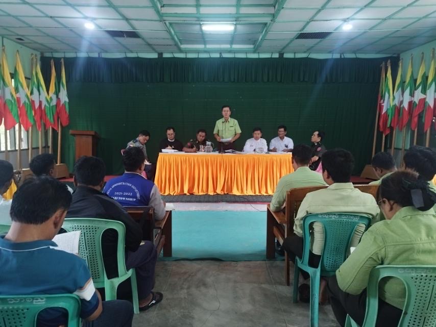 အစည်းအဝေးတွင် မြို့နယ်စီမံခန့်ခွဲရေးနှင့်အုပ်ချုပ်ရေးကော်မတီဥက္ကဋ္ဌ မြို့နယ်အုပ်ချုပ် ရေးမှူး ဦးမျိုးသက်ကျော်က ဒီဇင်ဘာ၂၈ရက်တွင် ကျင်းပမည့် ရွေးကောက်ပွဲဆိုင်ရာ လုပ်ငန်းများနှင့် ပတ်သက်သည့် ညွှန်ကြားချက်များအား ထပ်ဆင့်ရှင်းလင်းညွှန်ကြားပြီး မြို့နယ်စီမံခန့်ခွဲရေးနှင့် အုပ်ချုပ်ရေးကော်မတီအဖွဲ့ဝင် ဗိုလ်မှူးတေဇာမြင့်က ပြည်သူ့စစ်မှုထမ်းဆိုင်ရာကိစ္စရပ်များ၊ လုံခြုံရေးဆိုင်ရာကိစ္စရပ်များအားရှင်းလင်း ဆွေးနွေးသည်။ ယင်းနောက် ရပ်ကွက်/ကျေးရွာအုပ်စု အုပ်ချုပ်ရေးမှူးများနှင့် စာရေးဝန်ထမ်းများက သိရှိလိုသည်များ မေးမြန်းတင်ပြရာ မြို့နယ် စီမံခန့်ခွဲရေးနှင့်အုပ်ချုပ်ရေးကော်မတီဥက္ကဋ္ဌ နှင့်အဖွဲ့ဝင်များက လိုအပ်သည်များပေါင်းစပ် ညှိနှိုင်းခဲ့ကြကြောင်း သိရသည်။မြို့နယ်ပြန်/ဆက်