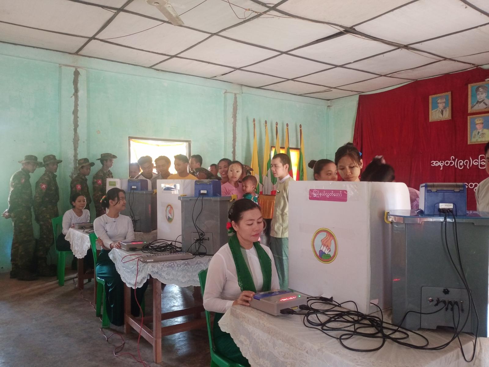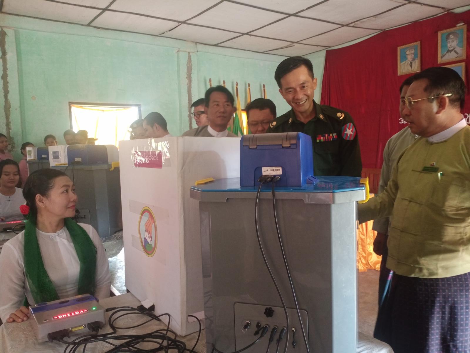 ဆက်လက်၍ ခရိုင်/မြို့နယ်ရွေးကောက်ပွဲကော်မရှင်အဖွဲ့ခွဲမှ တာဝန်ရှိများ၊ စက်ကိုင်ဆရာမများက တက်ရောက်လာကြသည့် တပ်နယ်အတွင်းရှိ မဲဆန္ဒရှင်ပြည်သူများအား လက်တွေ့စမ်းသပ်မဲ ပေးခြင်းတို့ကို ပြသပြုလုပ်ဆောင်ရွက်ခဲ့ကြောင်း သိရသည်။