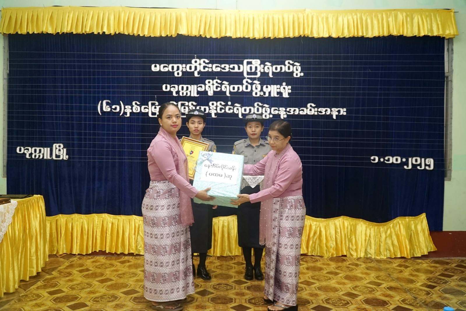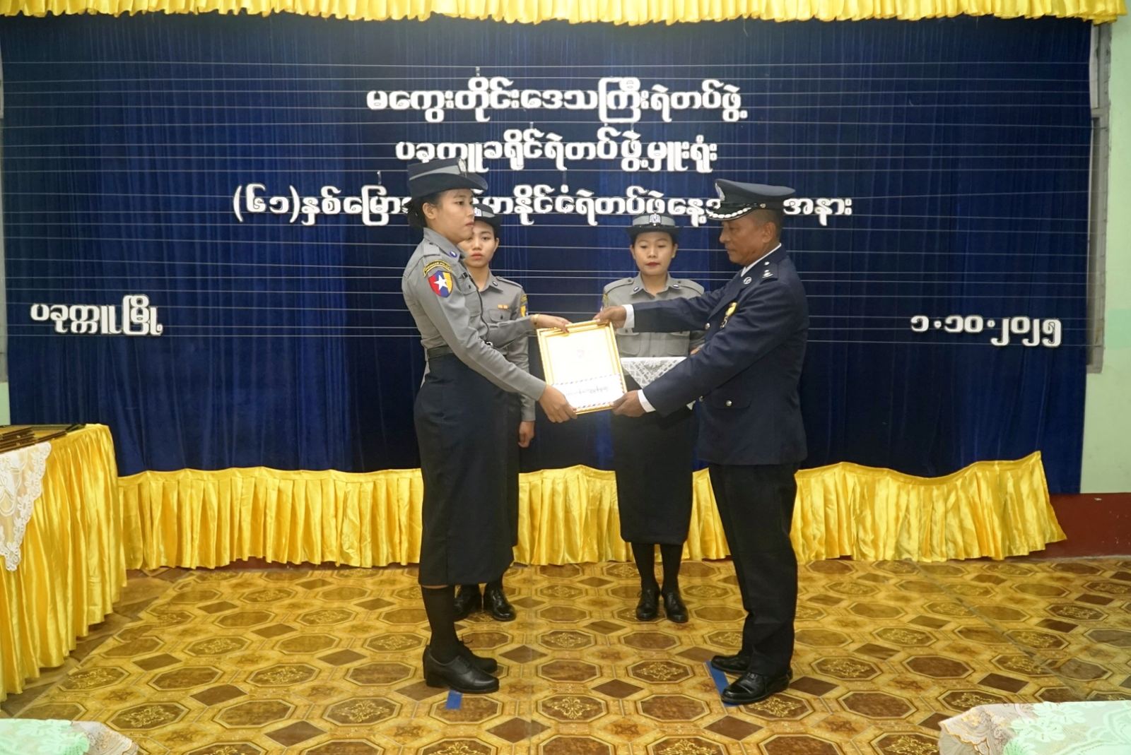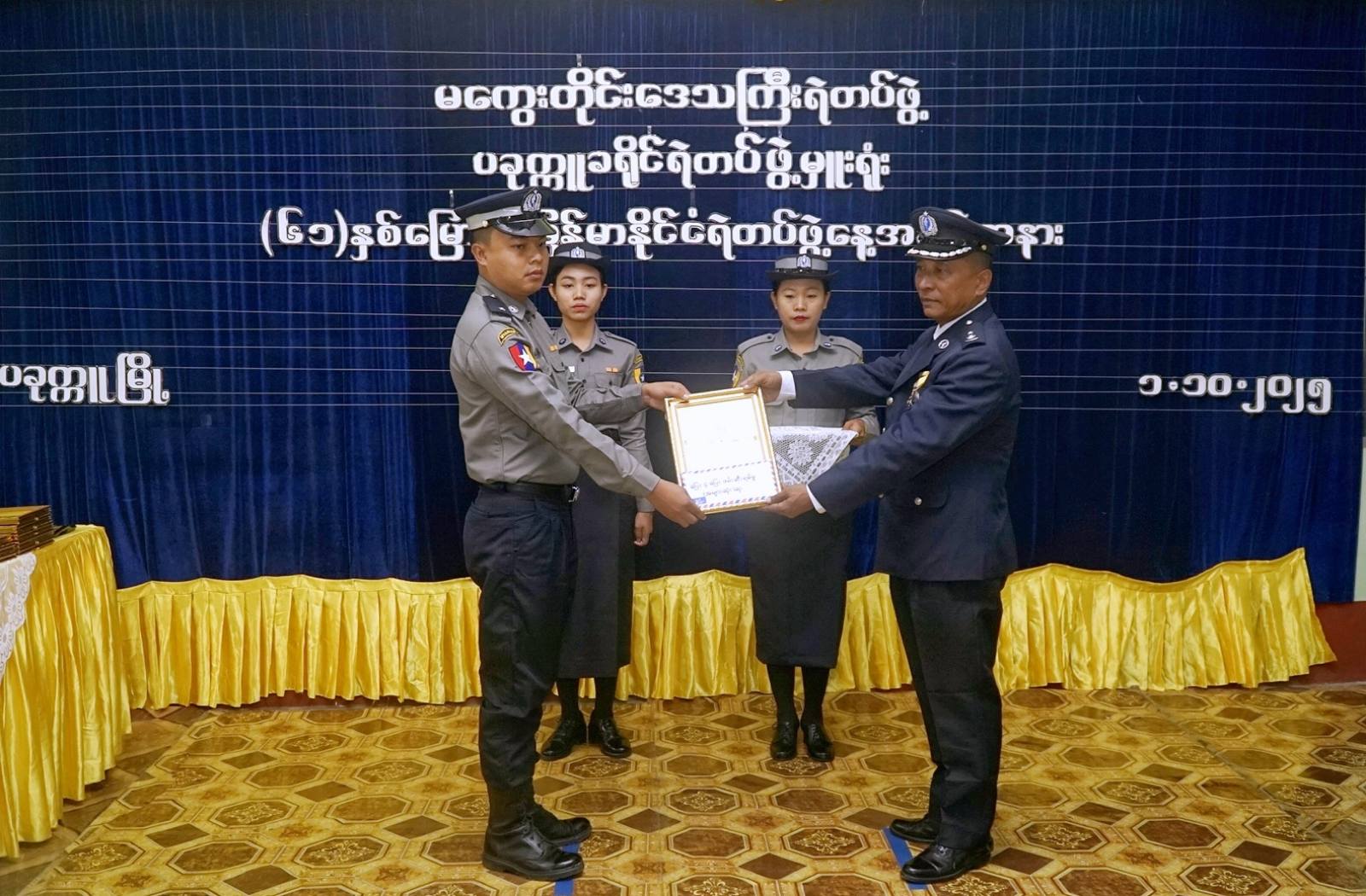 ထို့နောက် နယ်မြေလုံခြုံရေးနှင့် တရားဥပဒေစိုးမိုးရေးကိစ္စများတွင် ရဲတပ်ဖွဲ့နှင့်အတူ စွမ်းစွမ်းတမံ ပူးပေါင်းဆောင်ရွက်ခဲ့မှုအတွက် ဂုဏ်ပြုဆုများနှင့် ခရိုင်နှင့်မြို့နယ်ရဲတပ်ဖွဲ့မှူးရုံးများမှ နေအိမ်လိုင်းခန်း သန့်ရှင်းသပ်ရပ်မှုဆုတို့ကို တာဝန်ရှိသူများက ပေးအပ်ချီးမြှင့်ခဲ့ကြကြောင်း သိရသည်။