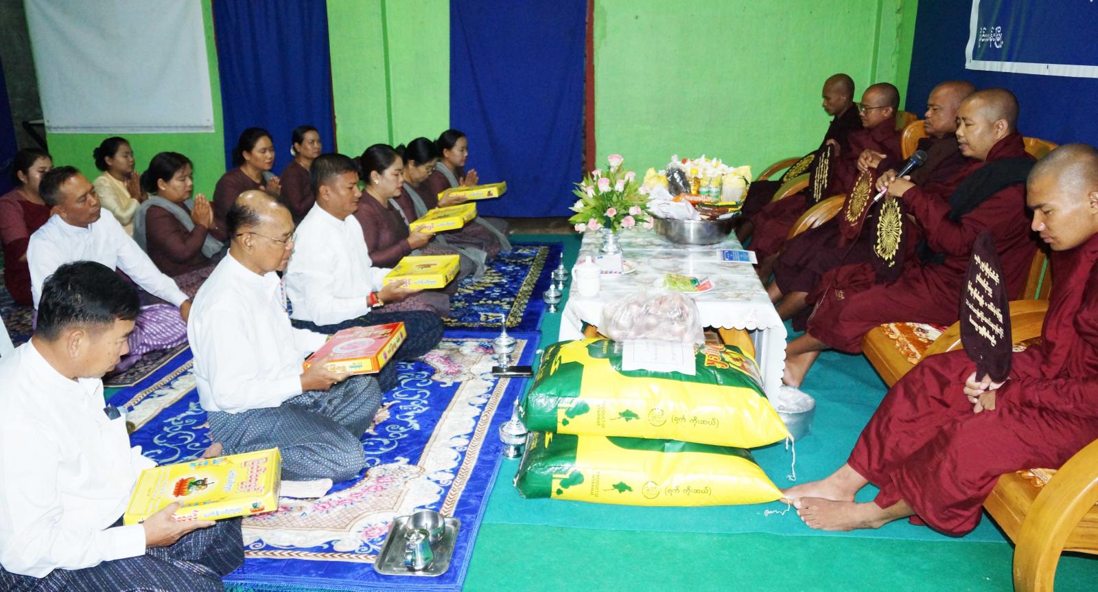 ရှေးဦးစွာ နံနက် ၅ နာရီခွဲတွင် ခရိုင်ရဲတပ်ဖွဲ့ရုံး၌ သံဃာတော်များအား အာရုဏ်ဆွမ်းကပ်လှူပြီး ထေရဝါဒဗုဒ္ဓသာသနာပြုကျောင်းဆရာတော် ဘဒ္ဒန္တနန္ဒဓဇ “သာသနတက္ကသီဓမ္မာစရိယ၊ မဟာသဒ္ဒမ္မဇောတိကဓဇ”ထံမှ ရှစ်ပါးသီလ ခံယူဆောက်တည်ကာ သံဃာတော် အရှင်သူမြတ်များ ရွတ်ဖတ်အပ်သော ပရိတ်တရားတော်ကိုနာယူ၍ ဝါဆိုသင်္ကန်းနှင့် ဝတ္ထုငွေလှူဖွယ်ပစ္စည်းများ ဆက်ကပ်လှူဒါန်းပြီး လှူဒါန်းဖွယ်အစုစုတို့အတွက် ရေစက်သွန်းချ အမျှအတန်းပေးဝေ ဆုတောင်းခဲ့ကြသည်။