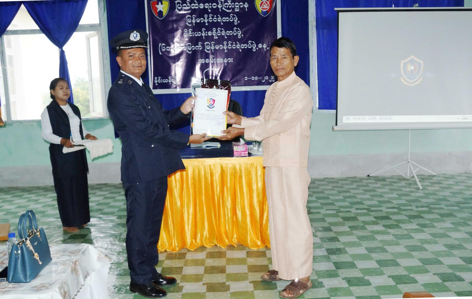 ထို့နောက် (၆၁) နှစ်မြောက် မြန်မာနိုင်ငံရဲတပ်ဖွဲ့နေ့ အထိမ်းအမှတ်အခမ်းအနားကို နံနက် ၈ နာရီတွင် ခရိုင်ရဲတပ်ဖွဲ့ရုံးခန်းမ၌ ဆက်လက်ကျင်းပရာ မိုင်းယန်းခရိုင်ရဲတပ်ဖွဲ့မှူး ဒုတိယရဲမှူးကြီး မင်းသိန်းက မြန်မာနိုင်ငံရဲတပ်ဖွဲ့ဌာနချုပ် ရဲချုပ် ဒုတိယရဲဗိုလ်ချုပ်ကြီး ဝင်းဇော်မိုးထံမှ ပေးပို့သည့်သဝဏ်လွှာအား ဖတ်ကြားပြီး ခရိုင်ရဲတပ်ဖွဲ့မှ ရဲတပ်သားသစ်စုဆောင်းနိုင်မှု၊ ပြေး(၄)ပြေး ဖမ်းဆီးနိုင်မှု၊ ရဲလုပ်ငန်းများဆောင်ရွက်နိုင်မှုနှင့် ရုံးလုပ်ငန်းများ တက်ကြွစွာဆောင်ရွက်မှု၊ လုပ်ငန်းများဆောင်ရွက်မှုအပေါ် စိတ်ပါဝင်စားစွာ ပံ့ပိုးကူညီပေးခဲ့ကြသူများအား ဂုဏ်ပြုမှတ်တမ်းလွှာနှင့် ဆုများချီးမြှင့်ပေးအပ်ခြင်းနှင့် တပ်ဖွဲ့ဝင်မိသားစုများ၏ နေအိမ်လိုင်းခန်း သန့်ရှင်းမှု၊ မွေးမြူရေးဆောင်ရွက်မှုနှင့် စိုက်ပျိုးရေးဆောင်ရွက်ထားရှိမှုများတွင် ပထမဆု၊ ဒုတိယဆု၊ တတိယဆုရရှိသူများအား ခရိုင်ရဲတပ်ဖွဲ့ မိသားစုစည်းရုံးရေးနှင့် စည်းကမ်းထိန်းသိမ်းရေးကော်မတီဥက္ကဋ္ဌ ဒေါ်နီလာစိန်နှင့်တာဝန်ရှိသူများက ဆုများကို အသီးသီး ပေးအပ်ချီးမြှင့်ခဲ့ကြကြောင်း သိရသည်။
