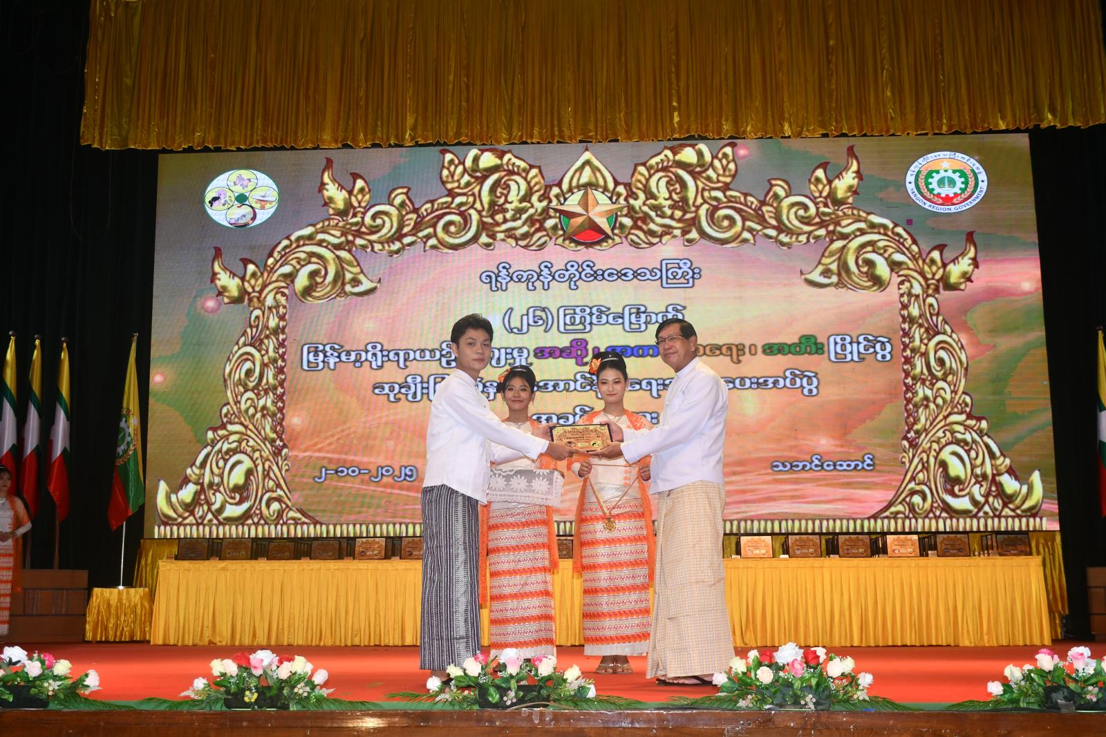 ရန်ကုန်တိုင်းဒေသကြီး (၂၆)ကြိမ်မြောက် မြန်မာ့ရိုးရာယဉ်ကျေးမှု အဆို၊ အက၊ အရေး၊ အတီး ပြိုင်ပွဲ ဆုချီးမြှင့်ပွဲနှင့် အောင်နိုင်ရေးအလံပေးအပ်ပွဲအခမ်းအနားကို ယမန်နေ့ နံနက်ပိုင်းက ရန်ကုန်တိုင်းဒေသကြီးအစိုးရအဖွဲ့ရုံး၊ သဘင်ဆောင်တွင် ကျင်းပသည်။