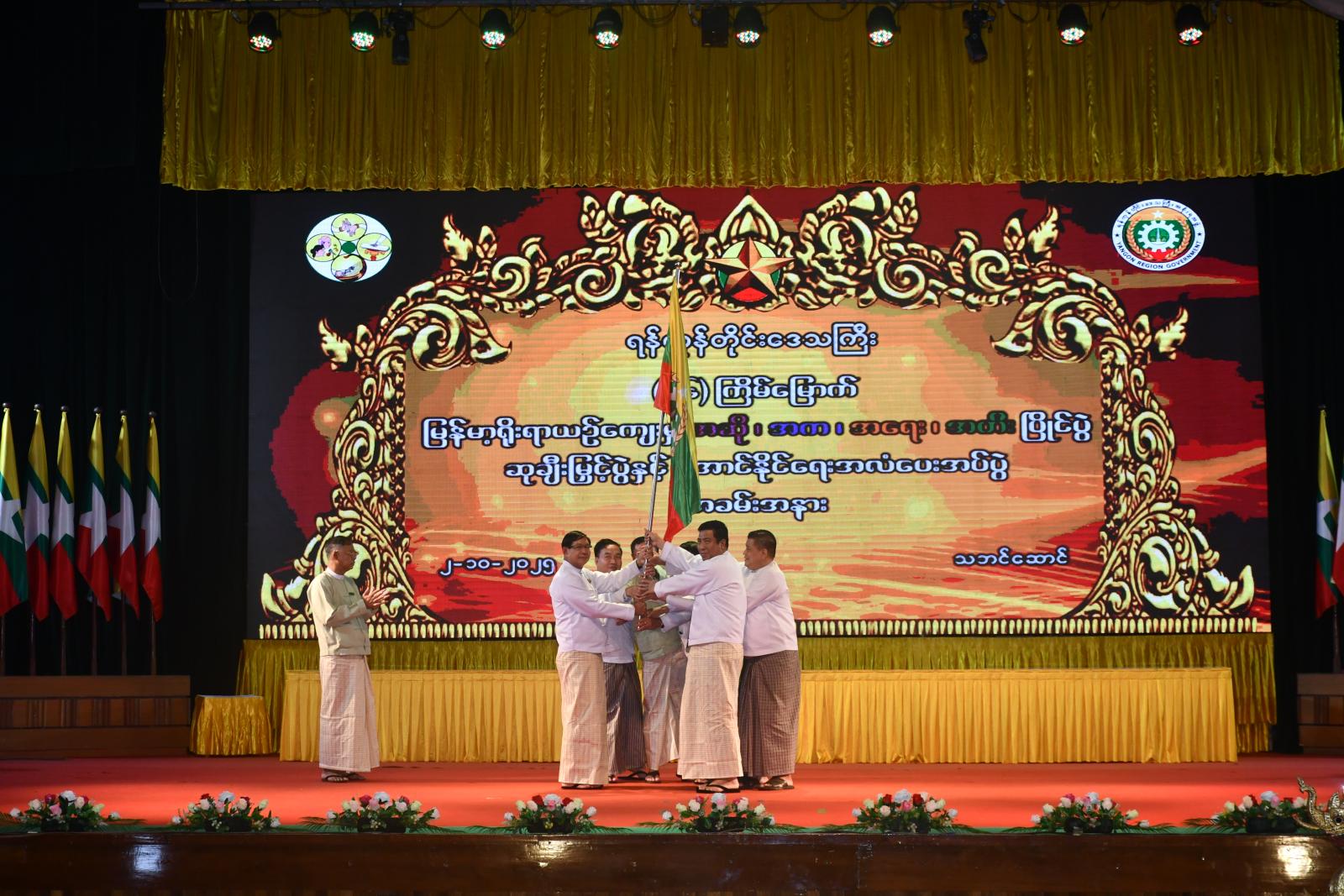 ထို့နောက် ရန်ကုန်တိုင်းဒေသကြီး (၂၆)ကြိမ်မြောက် မြန်မာ့ရိုးရာယဉ်ကျေးမှု အဆို၊ အက၊ အရေး၊ အတီး ပြိုင်ပွဲကျင်းပရေးဦးစီးကော်မတီ ဥက္ကဋ္ဌ၊ ရန်ကုန်တိုင်းဒေသကြီး ဝန်ကြီးချုပ် ဦးစိုးသိန်းက ပြိုင်ပွဲကျင်းပရေးဦးစီးကော်မတီဥက္ကဋ္ဌ၊ ရန်ကုန်တိုင်းဒေသကြီး လူမှုရေးရာဝန်ကြီး ဦးဌေးအောင်နှင့် တာဝန်ရှိသူများထံ အောင်နိုင်ရေးအလံကိုပေးအပ်ခဲ့ပြီး ဖျော်ဖြေရေးအဖွဲ့နှင့် အခမ်းအနား ဖြစ်မြောက်ရေးအတွက် ဝိုင်းဝန်းကူညီသူများအား ဂုဏ်ပြုချီးမြှင့်ငွေများ ပေးအပ်သည်။