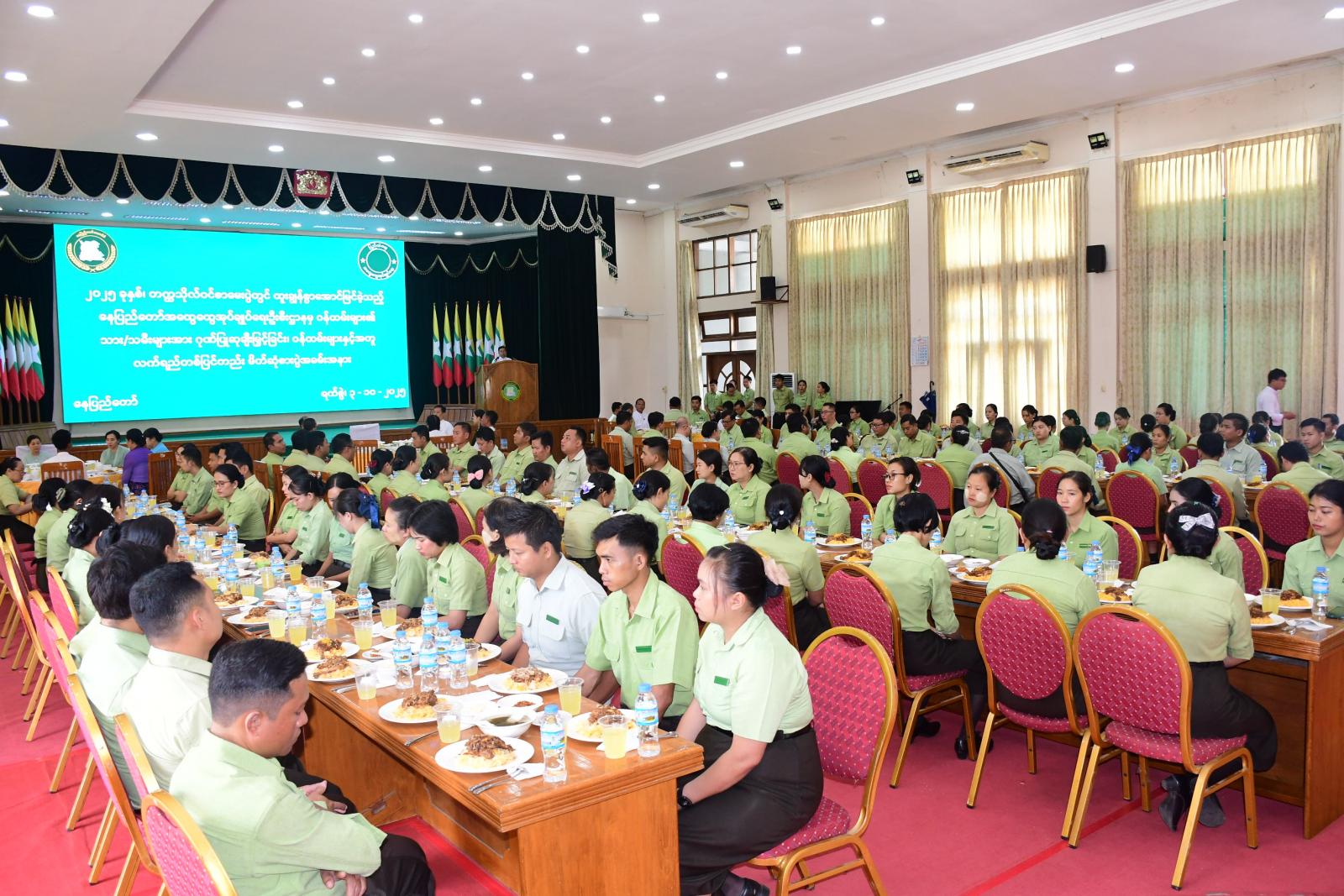 ၂၀၂၅ ခုနှစ်၊ တက္ကသိုလ်ဝင်စာမေးပွဲအောင်မြင်ခဲ့သည့် နေပြည်တော်အထွေထွေအုပ်ချုပ်ရေးဦးစီးဌာနမှ ဝန်ထမ်းမိသားစုများ၏ သား/သမီးများအား ဂုဏ်ပြုဆုချီးမြှင့်ခြင်းနှင့် ဝန်ထမ်းများနှင့်အတူ လက်ရည်တစ်ပြင်တည်း မိတ်ဆုံစားပွဲကို ယမန်နေ့နံနက်ပိုင်းတွင် နေပြည်တော်ကောင်စီ၊ ဇမ္ဗူသီရိခန်းမ၌ ကျင်းပရာ နေပြည်တော်ကောင်စီဥက္ကဋ္ဌ ဦးသန်းထွန်းဦးနှင့် ဇနီး ဒေါ်သီတာဇင်၊ နေပြည်တော်ကောင်စီဝင်များနှင့် ဇနီးများ၊ ခရိုင်/မြို့နယ် စီမံခန့်ခွဲရေးနှင့် အုပ်ချုပ်ရေးအဖွဲ့ဥက္ကဋ္ဌများ၊ နေပြည်တော်ကောင်စီရုံးမှ အရာထမ်း/ အမှုထမ်းများ၊ ကျောင်းသား၊ ကျောင်းသူများ တက်ရောက်ခဲ့ကြသည်။