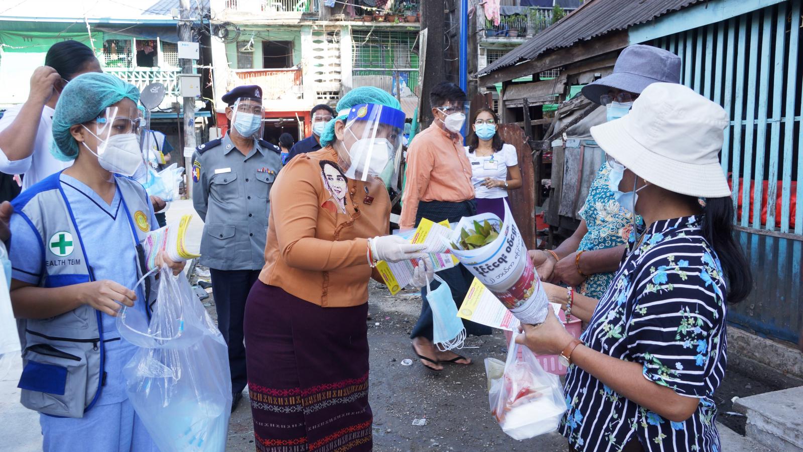 ရန်ကုန်တိုင်းဒေသကြီး ရန်ကုန်အရှေ့ပိုင်းခရိုင် တာမွေမြို့နယ်အတွင်း ကိုဗစ်-၁၉ရောဂါ ကူးစက်ပျံ့နှံ့မှုနှုန်းကို ကြိုတင်ကာကွယ် ထိန်းချုပ်နိုင်ရေးအတွက် ရန်ကုန်တိုင်းဒေသကြီးအစိုးရအဖွဲ့ လူဝင်မှုကြီးကြပ်ရေးနှင့် လူ့စွမ်းအား အရင်းအမြစ်ဝန်ကြီး ဒေါ်မိုးမိုးစုကြည်၏ ဦးဆောင်မှုဖြင့် တိုင်း / ခရိုင် / မြို့နယ်ကိုဗစ်-၁၉ရောဂါ ထိန်းချုပ်ရေးနှင့် အရေးပေါ်တုံ့ပြန်ရေး ကော်မတီဝင်များနှင့် ရပ်ကွက်အုပ်ချုပ်ရေးမှူးတို့ ပူးပေါင်းပြီး ယနေ့နံနက်ပိုင်းအချိန်က တာမွေမြို့နယ်ရှိ အရိုးကုန်းစျေးနှင့် မအူကုန်းလမ်းကျယ် တစ်လျှောက်တွင် စျေးရောင်းချနေသူများနှင့် စျေးလာရောက် ဝယ်ယူကြသူများအား နှာခေါင်းစည်း (Mask)နှင့် မျက်နှာကာ (Face shield)များ အခမဲ့ဖြန့် ဝေပေးခြင်းနှင့် ကိုဗစ်-၁၉ရောဂါနှင့် ပတ်သက်၍ ပြည်သူများ ကျယ်ကျယ် ပြန့်ပြန့် သိရှိနိုင်စေရန်အတွက် အသိပညာပေးခြင်းလုပ်ငန်းများကို အရှိန်အဟုန်မြှင့် ဆောင်ရွက်ခဲ့ကြသည်။