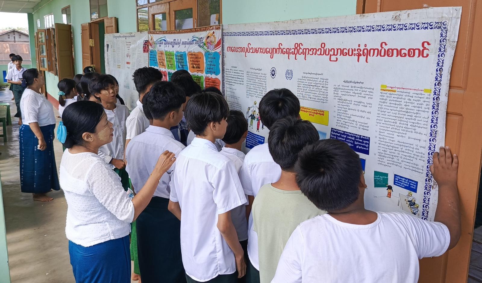 ထို့နောက် ပြန်ကြားရေးနှင့်ပြည်သူ့ဆက်ဆံရေးဦးစီးဌာနမှ ဝန်ထမ်းများက ကလေးအလုပ်သမား ပပျောက်ရေး နံရံကပ်စာစောင်နှင့် ပတ်သက်သည့် သိမှတ်ဖွယ်ရာများ၊ စာဖတ်ရှိန်မြှင့်တင်ရေး အသိပညာပေး နံရံကပ်စာစောင် ဆောင်ရွက်ထားရှိမှုများကိုပြသရာ ကျောင်းသား/ ကျောင်းသူများက စိတ်ပါဝင်စားစွာ ကြည့်ရှုလေ့လာမှတ်သားခဲ့ကြကြောင်း သိရသည်။