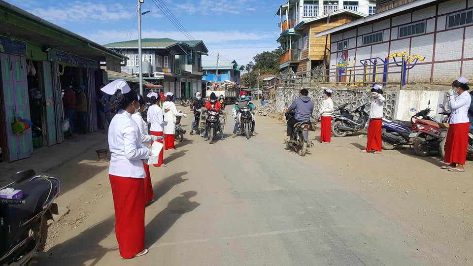 မြို့နယ်ကျန်းမာရေးဦးစီးဌာနမှူး ဒေါက်တာထန်ရှန်းခိုင်၏ ဦးဆောင်မှုဖြင့် ကျန်းမာရေးဝန်ထမ်းများက နေအိမ်ပြင်ပ ထွက်ခွာ လာသူသည့် ပြည်သူများ၊ ဈေးဝယ်သူများနှင့် ဈေးသည်များ လမ်းသွားလမ်းလာ ဖြတ်သန်းမှုများသည့် လမ်းများတွင် ပါးစပ် နှင့်နှာခေါင်းစည်း (Mask)များ အခမဲ့ဝေငှခြင်းနှင့် ကျန်းမာရေးဦးစီးဌာန၏ ညွှန်ကြားချက်များ သိရှိလိုက်နာစေရေး အသိပညာ ပေးပြောကြားခြင်းနှင့် Mask (500)ခုအား အခမဲ့ ဖြန့်ဝေပေးခဲ့ကြောင်း သိရသည်။