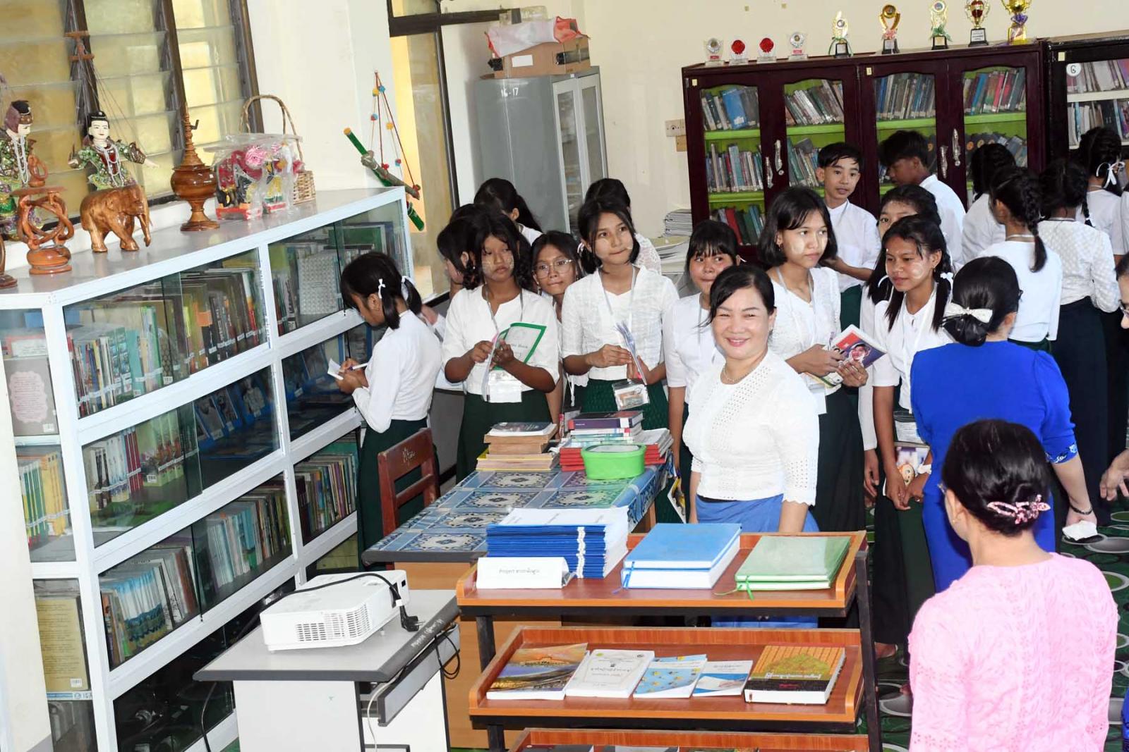 ဆက်လက်၍ကျောင်းသား/သူများ၊ ဆရာ/မများ သင်ကြားသင်ယူမှုတွင် အထောက်အကူဖြစ်စေရည်ရွယ်၍ ဖွင့်လှစ်ထားရှိသည့် စာကြည့်တိုက်အား ကျောင်းသား/သူများက ကြည့်ရှုအားပေးပြီး ကျောင်းသား/ သူများက ကျောင်းများတွင် ပြုလုပ်ကျင်းပပေးနေသည့် ကဗျာနှင့်စာစီစာကုံးပြိုင်ပွဲ၌ ပါဝင်ယှဉ်ပြိုင် နိုင်ရန်အတွက် သိရှိလိုသည် များကိုမေးမြန်းရာ သက်ဆိုင်ရာဌာနမှူးက ပြန်လည်ဖြေ ကြားသည်။