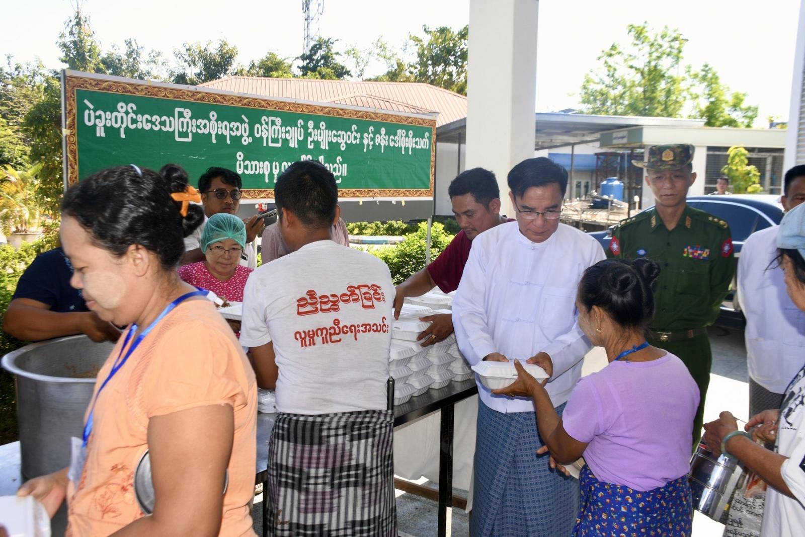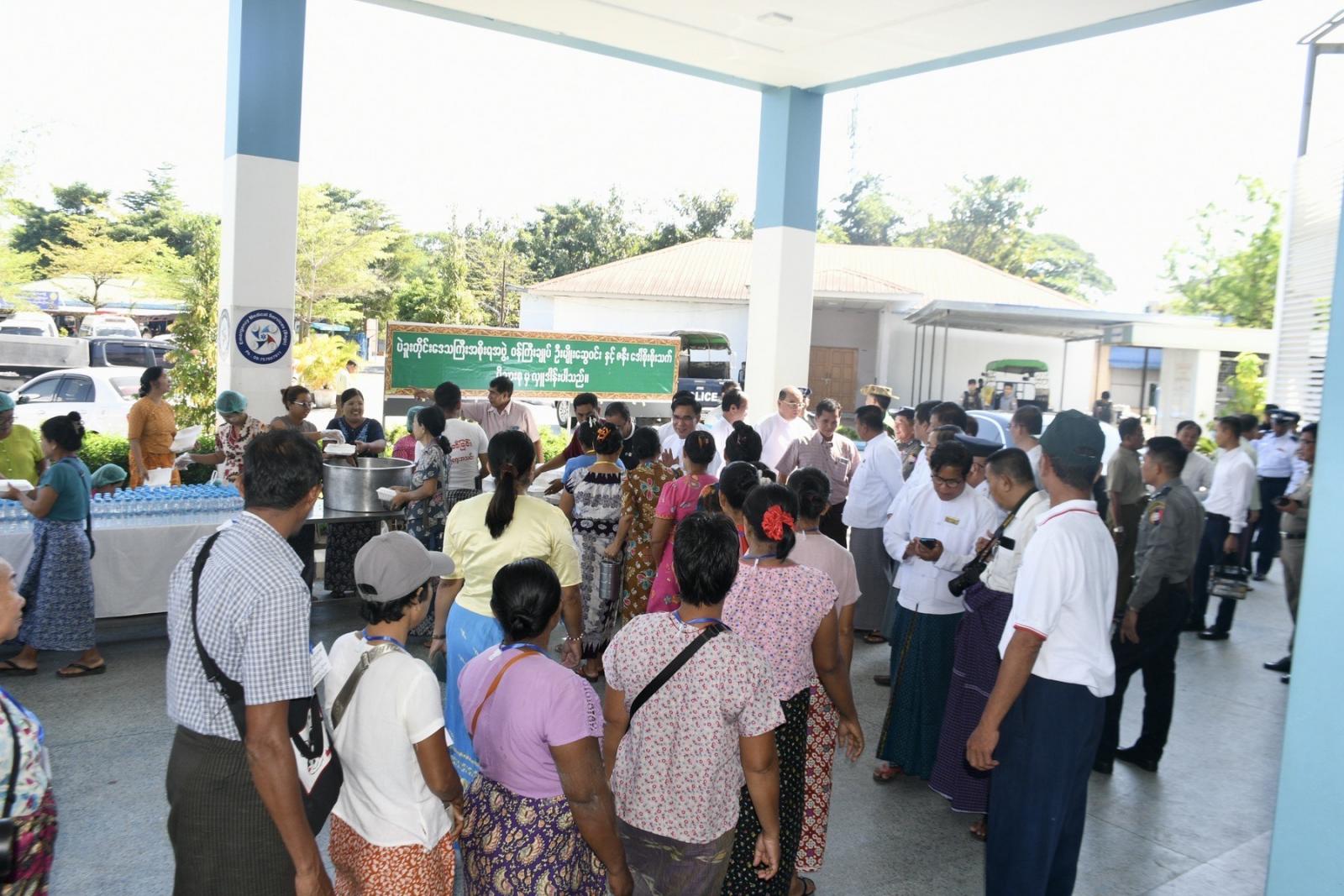 ယင်းနောက် တိုင်းဒေသကြီး ဝန်ကြီးချုပ်နှင့် တာဝန်ရှိသူများသည် မျက်စိခွဲစိတ်လူနာများနှင့် လူနာစောင့်များအတွက် နေ့လယ်စာထမင်းဘူးများ၊ သောက်ရေသန့်ဘူးနှင့်မုန့်များ ကျွေးမွေးလှူဒါန်းပေးခဲ့ကြကြောင်း သိရသည်။