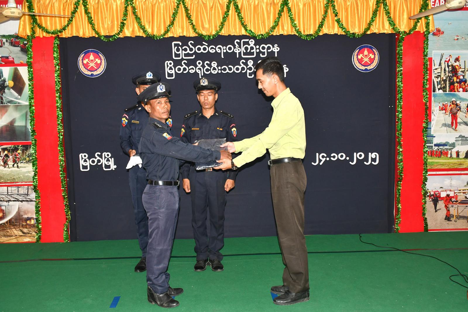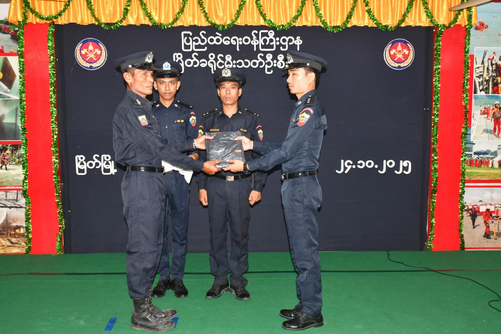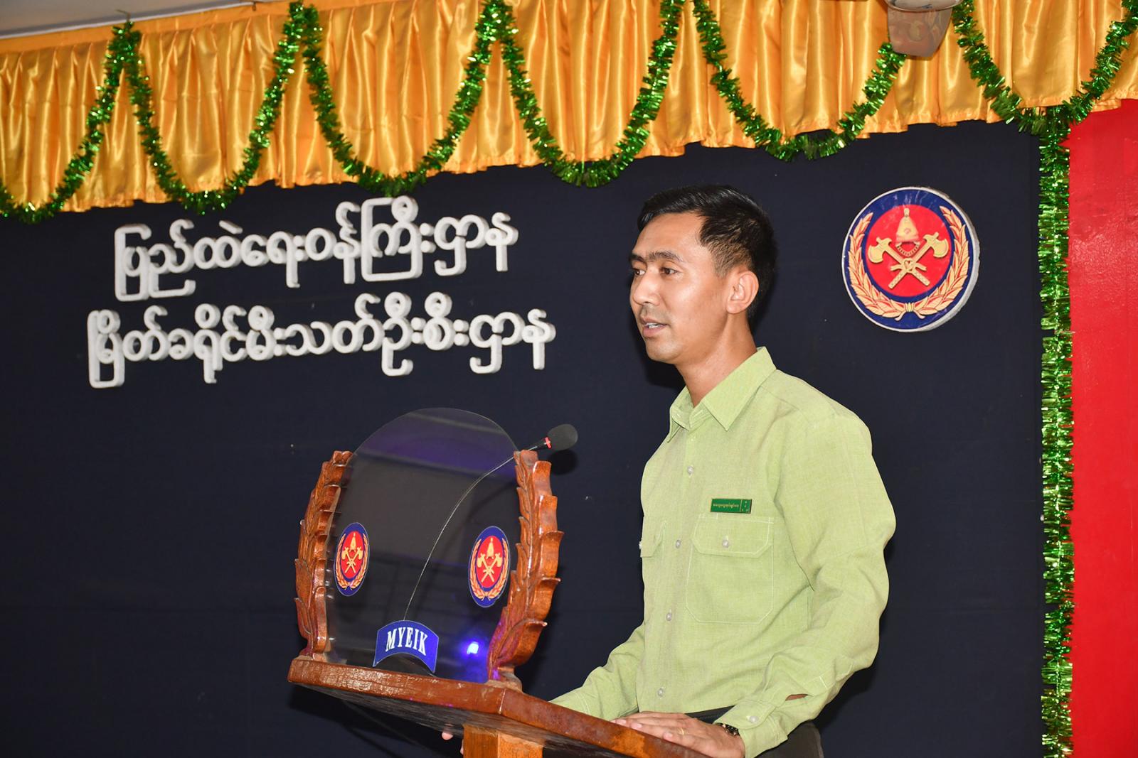 တနင်္သာရီတိုင်းဒေသကြီး မြိတ်မြို့တွင် အရန်မီးသတ်တပ်ဖွဲ့ဝင်များအနေဖြင့် မီးသတ်တပ်ဖွဲ့လုပ်ငန်းများနှင့် ပြည်သူ့အကျိုးပြုလုပ်ငန်းများ ဆောင်ရွက်ရာ၌ အဆင်ပြေချောမွေ့မှုရှိစေရန်အတွက် အရန်မီးသတ်တပ်ဖွဲ့ဝင်များအား တပ်ဖွဲ့ဝင် တူညီဝတ်စုံ ပေးအပ်ခြင်းအခမ်းအနားကို မြိတ်ခရိုင် မီးသတ်ဦးစီးဌာန အစည်းအဝေးခန်းမတွင် ယမန်နေ့ ည (၇) နာရီက ကျင်းပသည်။