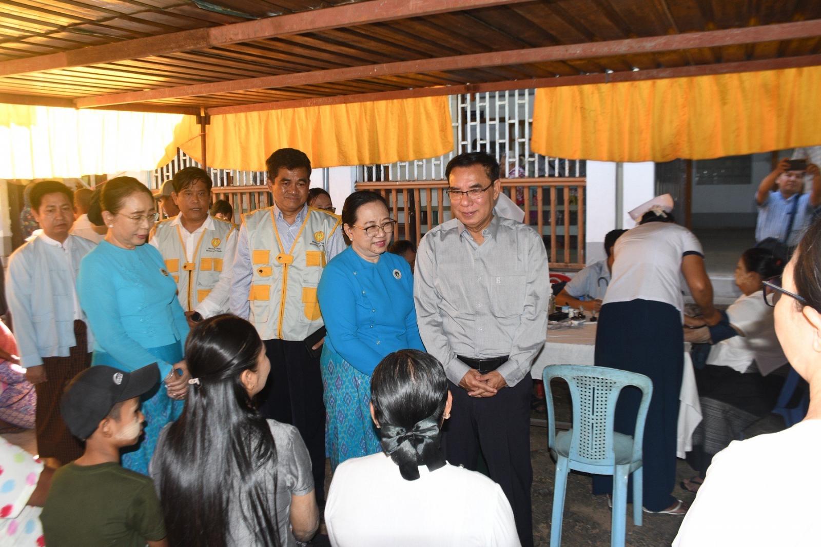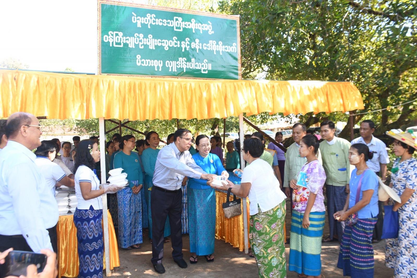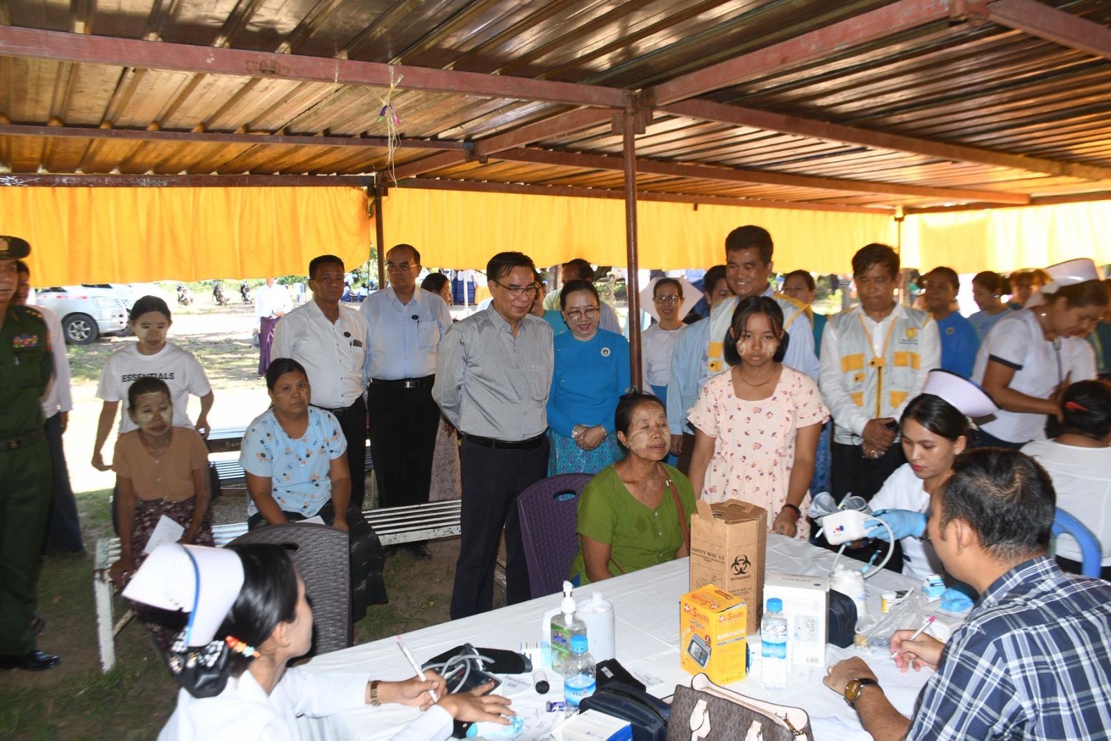 တိုင်းဒေသကြီးဝန်ကြီးချုပ်နှင့် ဇနီး၊ တိုင်းဒေသကြီးဝန်ကြီးများနှင့် ၎င်းတို့၏ ဇနီးများ၊ တိုင်းဒေသကြီးပြည်သူ့ကျန်းမာရေးနှင့်ကုသရေးဦးစီးဌာနမှူး ဒေါက်တာဇော်မင်းထွန်း၊ ပဲခူးမြို့ ခုတင်(၅၀၀)ဆံ့ အထွေထွေရောဂါကု ဆေးရုံအုပ်ကြီး ဒေါက်တာဇော်လွင်၊ ဒုတိယဆေးရုံအုပ်ကြီး ဒေါက်တာသန္တာဆွေ၊ ပဲခူးခရိုင်/မြို့နယ် စီမံခန့်ခွဲရေးနှင့်အုပ်ချုပ်ရေးအဖွဲ့ ဥက္ကဋ္ဌများနှင့်အတူ ဆေးကုသမှုလာရောက်ခံယူကြသည့် ပြည်သူများအား အားပေးစကားပြောကြားကာ အထူးကုဆရာဝန်ကြီးများက ဆေးကုသပေးနေမှုအား လိုက်လံကြည့်ရှုအားပေးပြီး လိုအပ်သည်များဖြည့်ဆည်းဆောင်ရွက်ပေးသည်။ ထို့နောက် တိုင်းဒေသကြီး ဝန်ကြီးချုပ်နှင့် ဇနီးတို့သည် ဆေးကုသမှုခံယူကြသူများအား နေ့လည်စာထမင်းဘူးနှင့်ရေသန့်တို့အား ပေးအပ်ခဲ့ပြီး အထူးကုဆရာဝန်ကြီးများ၊ ကျန်းမာရေးဝန်ထမ်းများနှင့် ကူညီဆောင်ရွက်ခဲ့ကြသည့် ပရဟိတအဖွဲ့များအား ဂုဏ်ပြုချီးမြှင့်ငွေများ ပေးအပ်သည်။