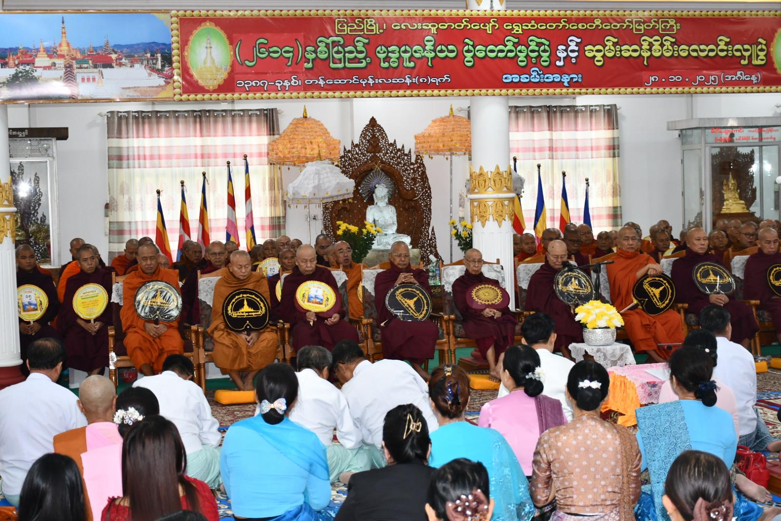 ဦးစွာ နံနက် ၅ နာရီခွဲအချိန်တွင် ဗုဒ္ဓမြတ်စွာအမှူးပြုသော ဩဝါဒါစရိယဆရာတော်ကြီး ၁၀ ပါးအပါအဝင် သံဃာတော် ၁၀၈ ပါးတို့ကို အရုဏ်ဆွမ်းဆက်ကပ်လှူဒါန်းပြီး စေတီတော်ရင်ပြင် အာရုံခံတန်ဆောင်း(၄)ခု၌ သံဃာတော် ၂၇ပါးစီဖြင့်ဗုဒ္ဓါဘိသေက ဘုရားအနေကဇာ တင်ခြင်း၊ စေတီတော်ရှိပုညကရဏ လေးထပ်ဓမ္မာရုံ၌ ဩဝါဒါစရိယဆရာတော်ကြီး ၁၀ပါးနှင့် သံဃာတော် ၉၈ ပါးတို့ကို ပင့်ဖိတ်၍ တရားတော်နာယူပွဲကျင်းပကာ လှူဖွယ်ဝတ္ထုပစ္စည်းများ ဆက်ကပ်လှူဒါန်းခြင်းတို့ပြုလုပ်သည်။