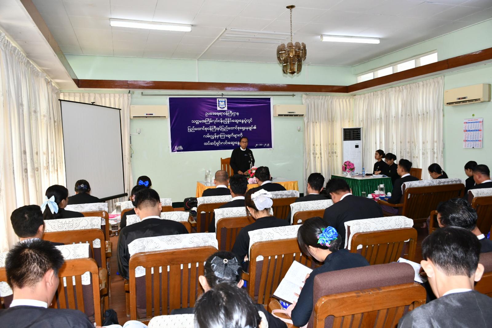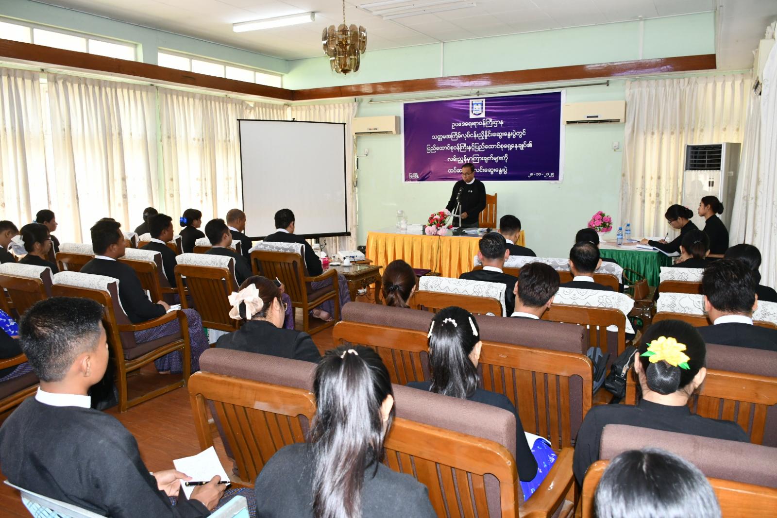 ဥပဒေရေးရာဝန်ကြီးဌာန သတ္တမအကြိမ်လုပ်ငန်းညှိနှိုင်းဆွေးနွေးပွဲတွင် ပြည်ထောင်စုဝန်ကြီးနှင့် ပြည်ထောင်စုရှေ့နေချုပ်၏ လမ်းညွှန်မှာကြားချက်များကို ပဲခူးတိုင်းဒေသကြီးဥပဒေချုပ် ဦးခင်မောင်တင့်မှ ထပ်ဆင့်ရှင်းလင်းဆွေးနွေးပွဲအား ပြည်မြို့၌ ယနေ့နံနက်ပိုင်းကကျင်းပရာ ပဲခူးတိုင်းဒေသကြီး အနောက်ခြမ်းရှိ သာယာဝတီခရိုင်၊ နတ္တလင်းခရိုင်၊ ပြည်ခရိုင်နှင့် မြို့နယ်ဥပဒေရုံးများမှ ဥပဒေအရာရှိ ၄၅ ဦးတက်ရောက်သည်။