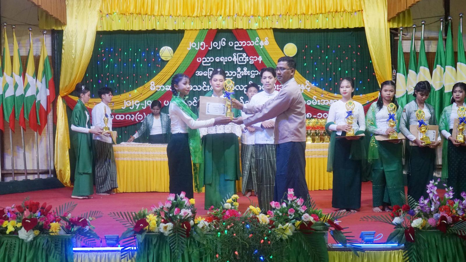 ထို့နောက် ၂၀၂၄-၂၀၂၅ ပညာသင်နှစ်၊ Grade-1 မှ Grade-12 အထိ ထူးချွန် ကျောင်းသား၊ ကျောင်းသူ ၁၀၆ ဦး၊ ကျောင်းတက်ရက်မှန် နှင့် ဘာသာရပ်သင် ထူးချွန်ဆု ဆရာ၊ ဆရာမ ၄၆ ဦး စုစုပေါင်း ၁၅၃ ဦးကို မြို့နယ် စီမံခန့်ခွဲရေးနှင့် အုပ်ချုပ်ရေးကော်မတီ ဥက္ကဋ္ဌနှင့် တာဝန်ရှိသူများက ဆုများအသီးသီးချီးမြှင့်ခဲ့ကြပြီး၊ ကျောင်းသား၊ ကျောင်းသူများက ပညာလမ်းမို့ တို့ပျော်သည်၊ အဖြူရောင်သံစဉ်၊ ခါးလှည့်ကွင်းစွမ်းရည် အက၊ ဗုဒ္ဓပူဇနိယ ၊ မြပန်းခွေ၊ အ အက္ခရာ အောင်ပါစေ၊ အနာဂတ်ကို ပိုင်စိုးသူ စသည့် တေးသီချင်းများဖြင့် ကပြဖျော်ဖြေတင်ဆက်ခဲ့ကြ တက်ရောက်လာကြသည့် ဌာနဆိုင်ရာများ၊ မိဘများက ဂုဏ်ပြုဆုငွေများ ပေးအပ်ချီးမြှင့်ခဲ့ကြောင်း သိရသည်။